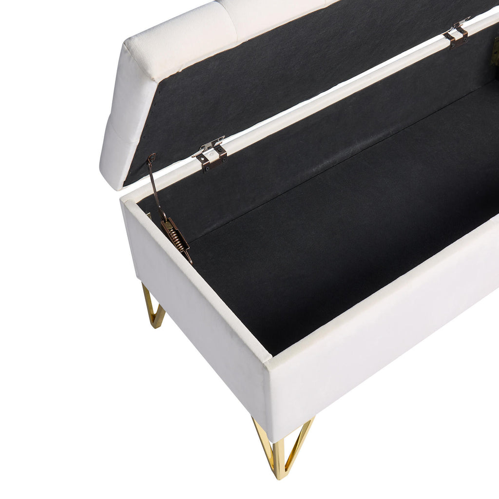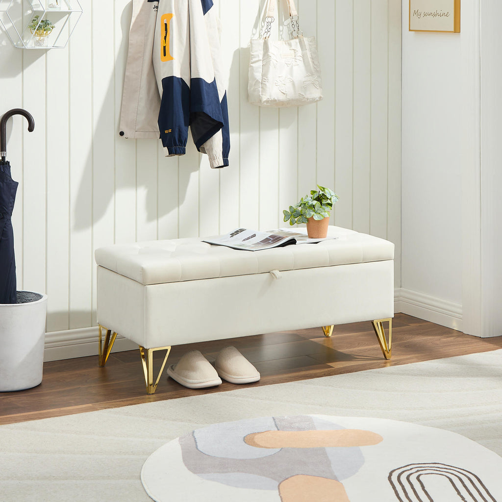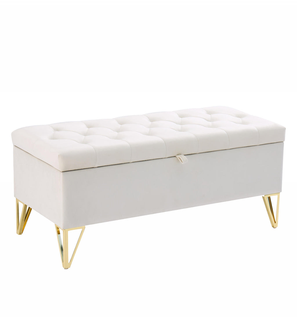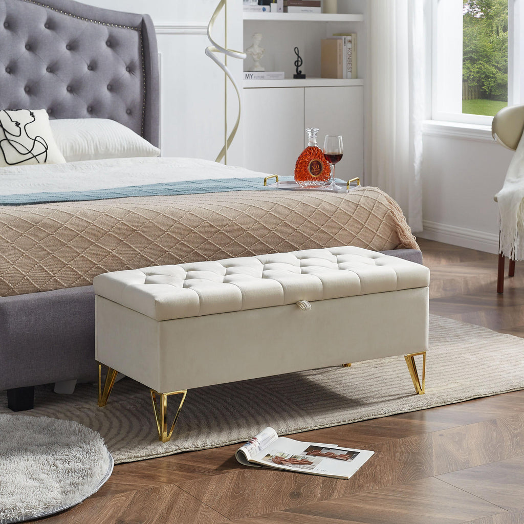 Upholstered storage rectangular bench for Entryway Bench,Bedroom end of Bed bench foot of the Bed,Bench Entryway,Light beige Velvet Fabric in gold stainless steel leg