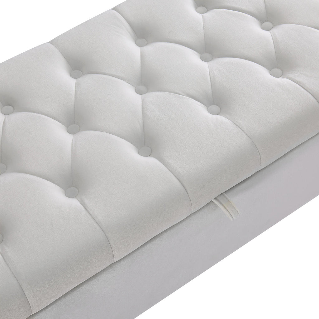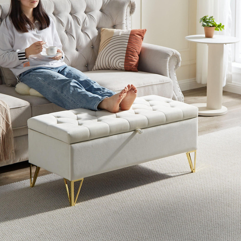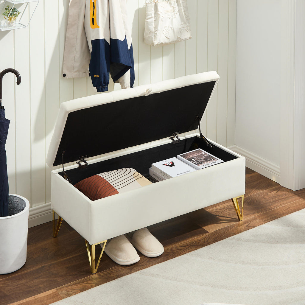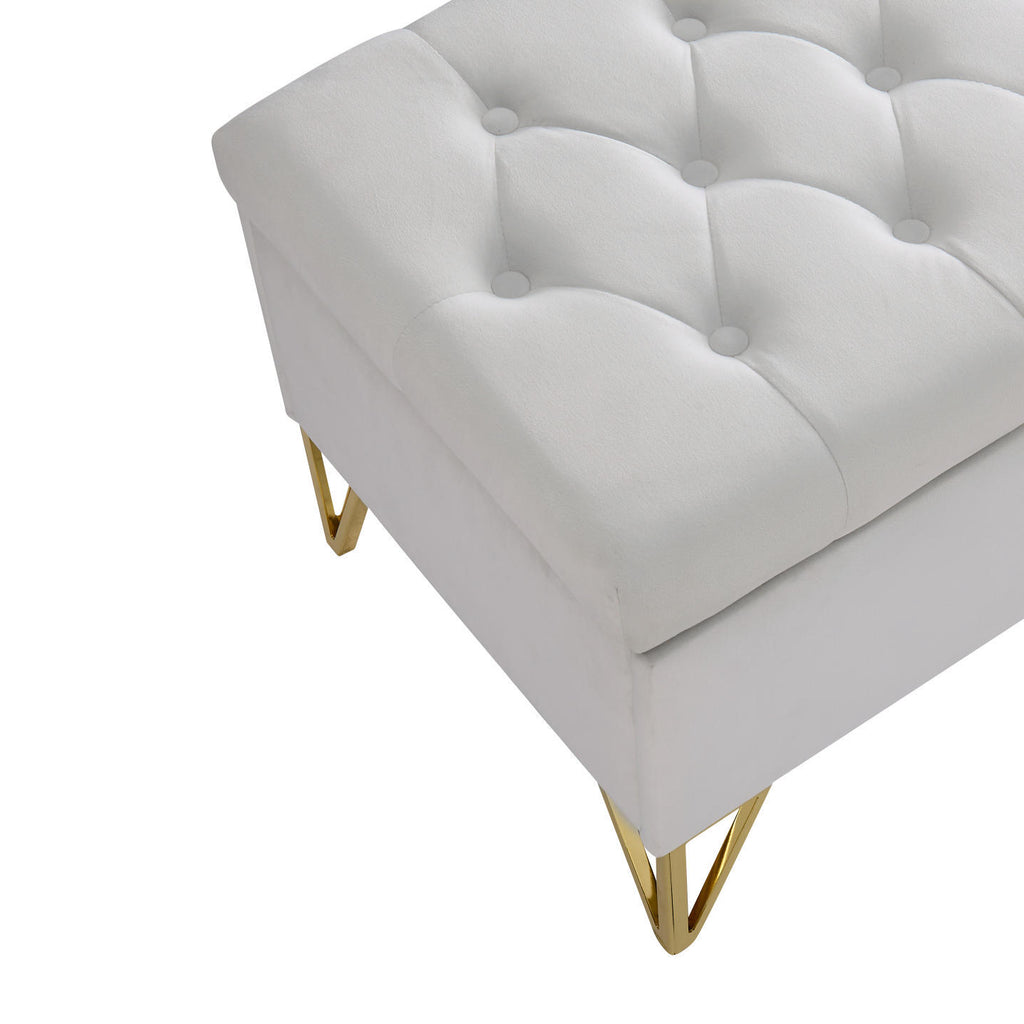 Upholstered storage rectangular bench for Entryway Bench,Bedroom end of Bed bench foot of the Bed,Bench Entryway,Light beige Velvet Fabric in gold stainless steel leg