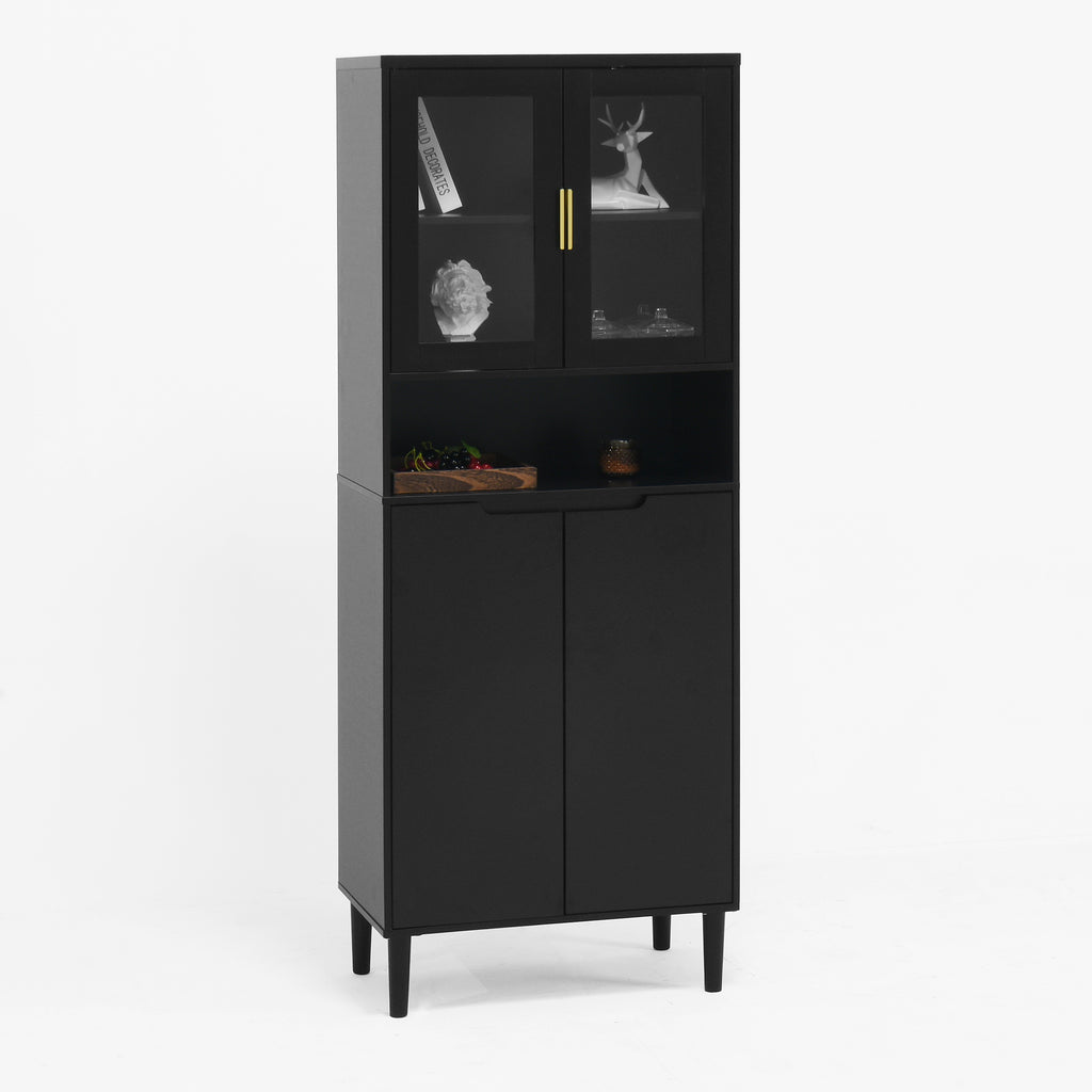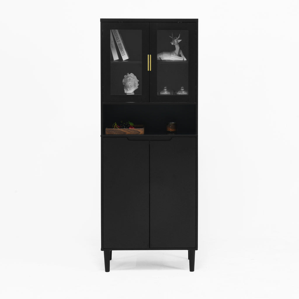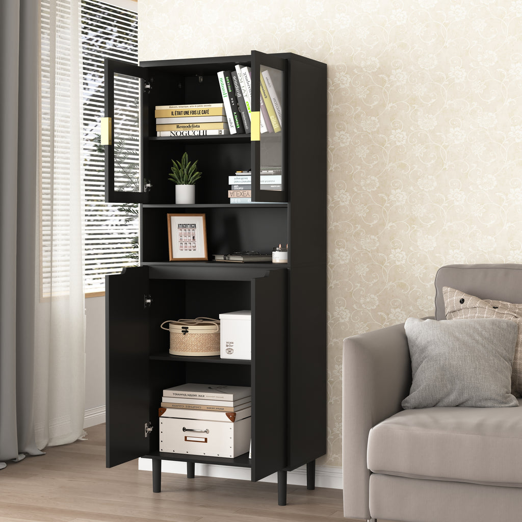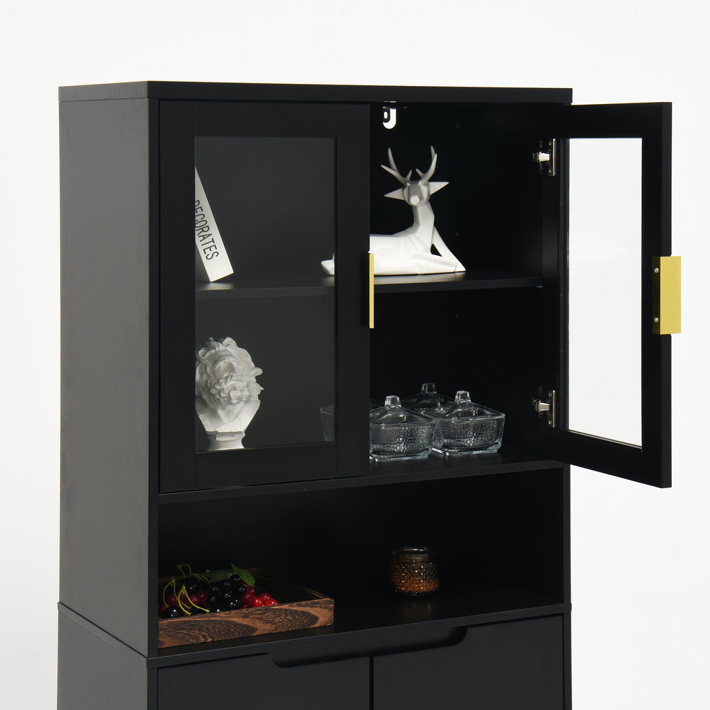 - With its elegant yet chic appearance and classified practical design, this black cabinet is suitable for various places: living room, kitchen pantry, bathroom, office, entryway, or any corner, even as buffet cabinet at dining room. Moreover, the top storage cabinet is equipped with two glass doors, allowing it to be used as a filing cabinet, display cabinet, or bookcase in a home office.
