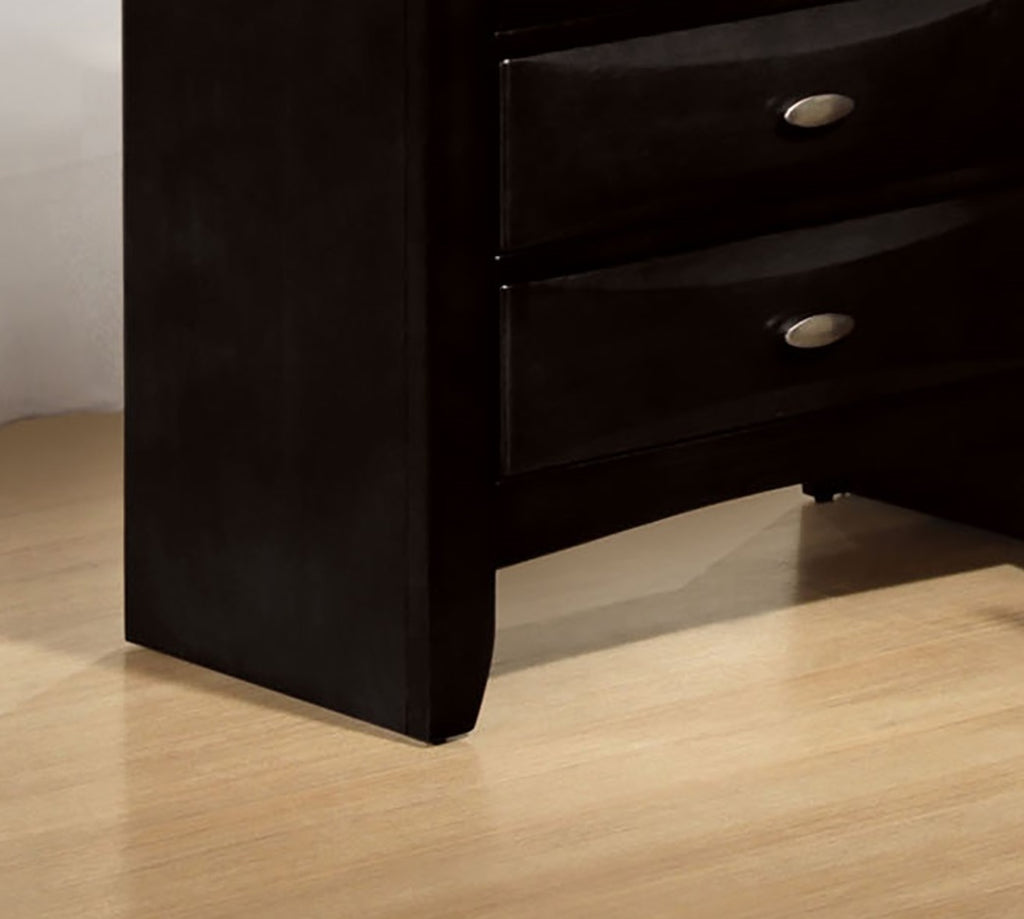 A transitional design in a soft black finish ideal if you're aiming for a blend of modern and classic aesthetics. Constructed using a combination of engineered wood, solid wood, and other materials, providing both durability and refined craftsmanship. Features smooth nickel oval knob hardware, adding a subtle yet elegant metallic accent to the chest.
