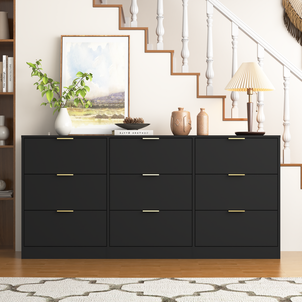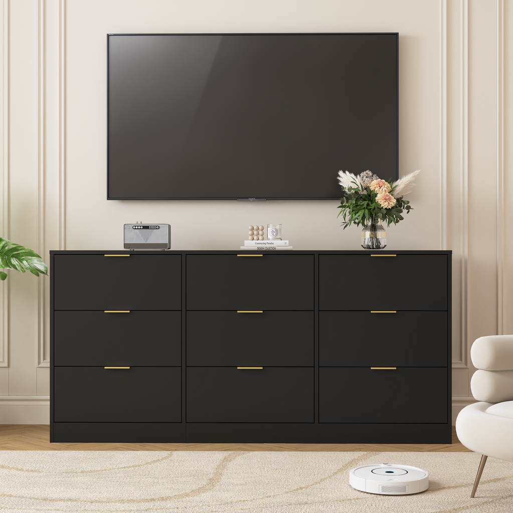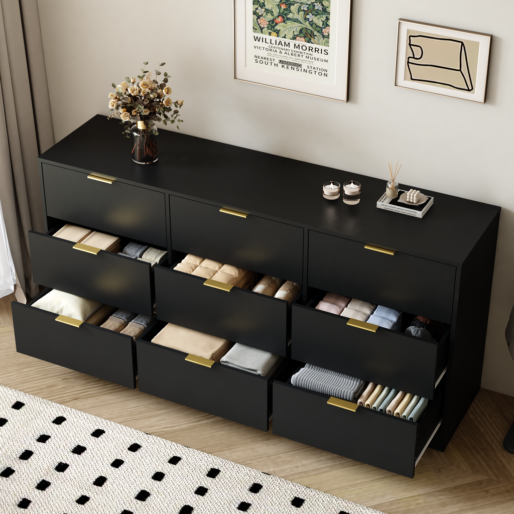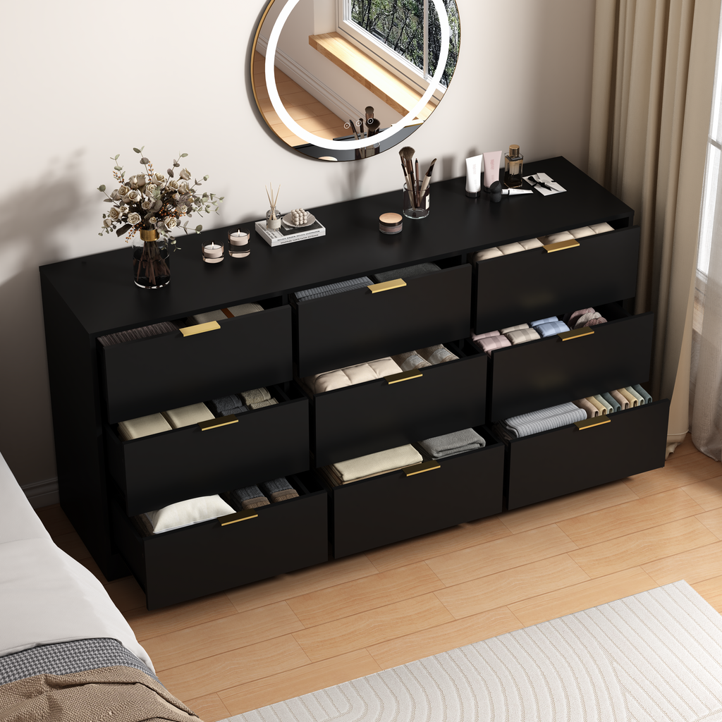 - Modern 9 Drawer Dressers: This large black chest of drawers with golden handles has a classic, simple design fit well in any decor style, creating a spacious and versatile look for your room