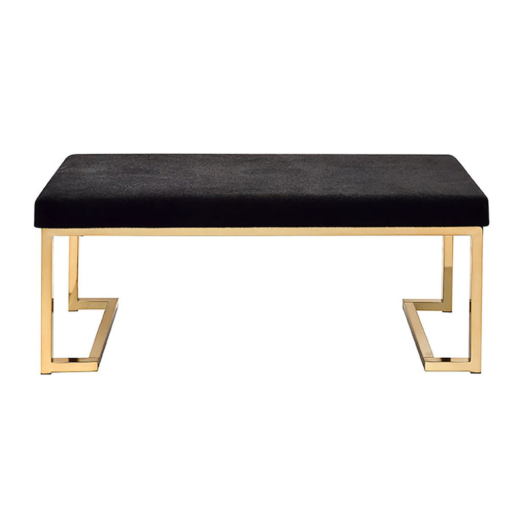 This sleek bench showcases a minimalist design with a cushioned, black upholstered seat atop a champagne finish metal base, offering both comfort and style. Its open return base and simple rectangular form highlight the collection's elegant and minimalist aesthetic, perfect for modern interiors.