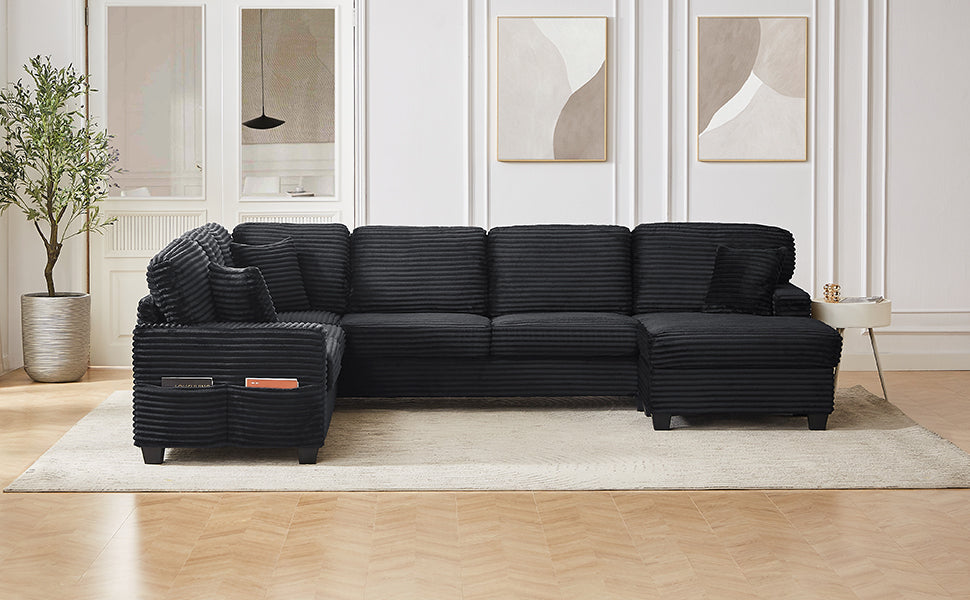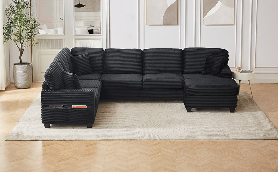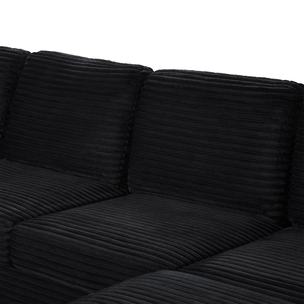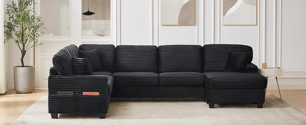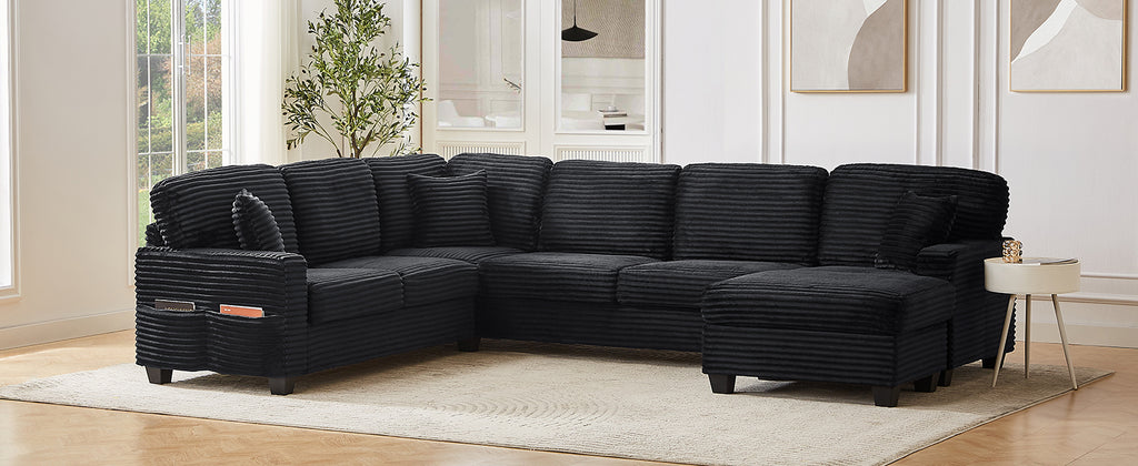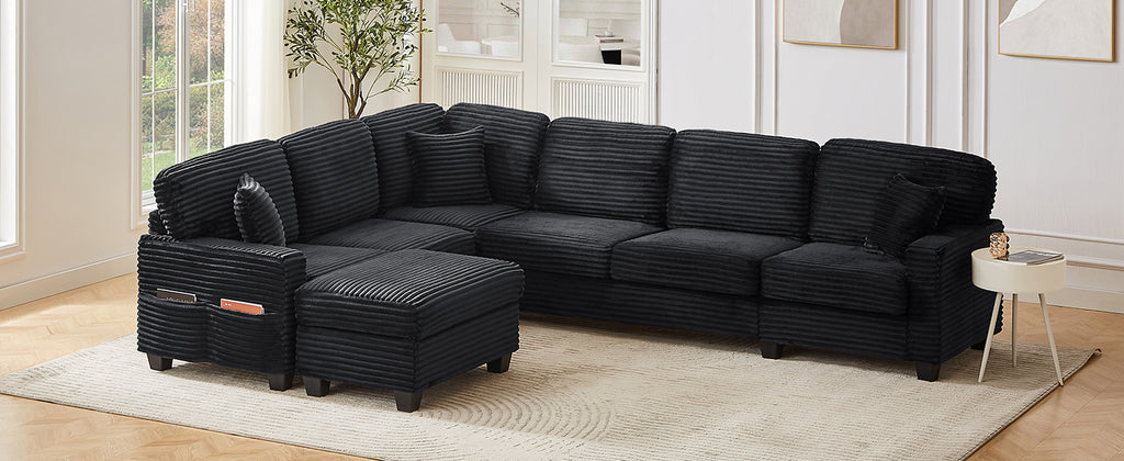 This modular sectional sofa combines versatile functionality with cozy style. Easily transformable into L-shaped or U-shaped configurations, it adapts to any living space or occasion. Upholstered in soft, ribbed corduroy, it offers both comfort and durability. Thoughtful details like built-in armrest storage pockets and matching throw pillows enhance convenience and visual appeal, making it the perfect blend of comfort, practicality, and modern design.
