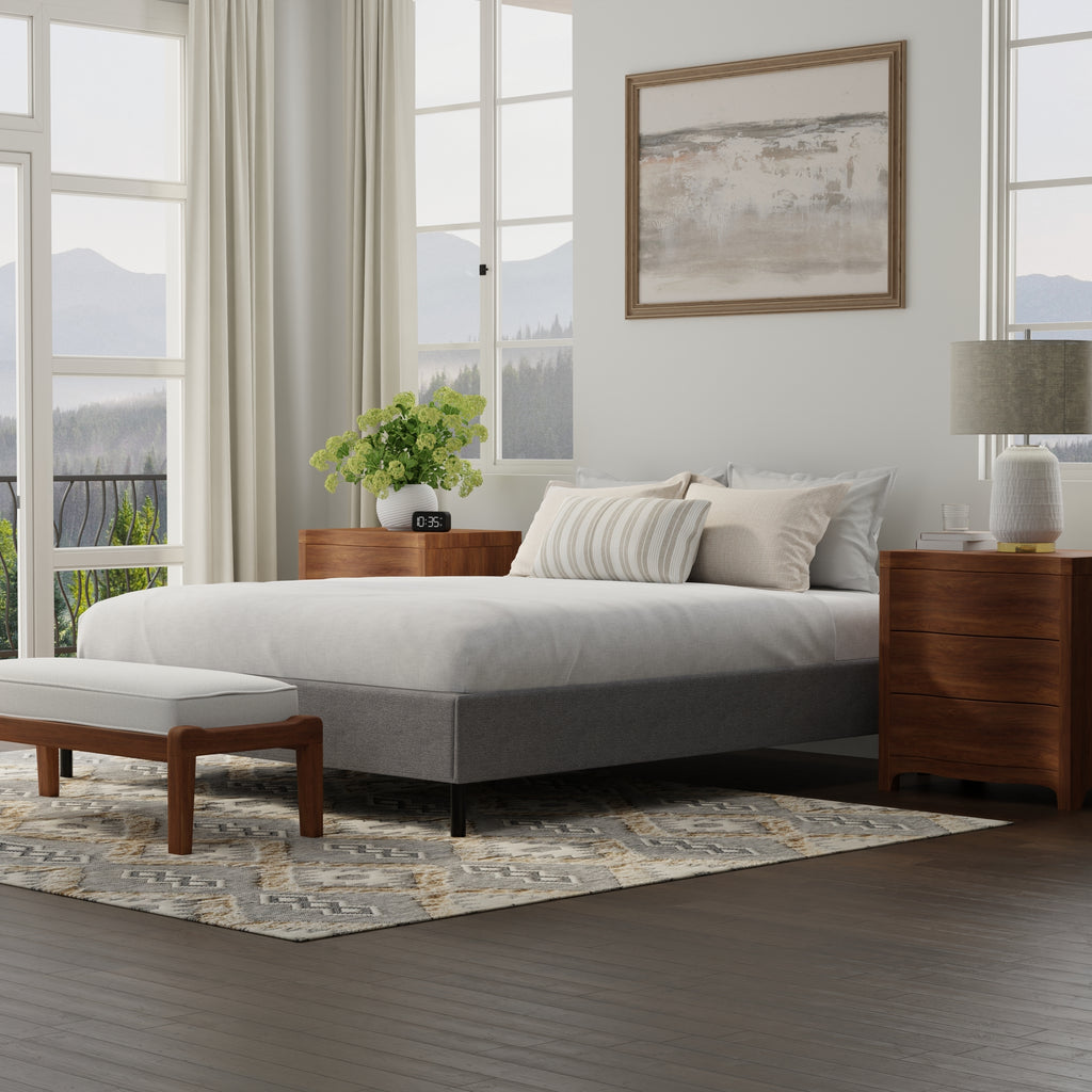 Experience luxurious comfort with our King upholstered bed frame, featuring a stylish black+gray finish. Its robust design supports up to 1,000 lbs, eliminating the need for a box spring. Enjoy tool-free assembly and universal mattress compatibility for effortless, restful sleep.
