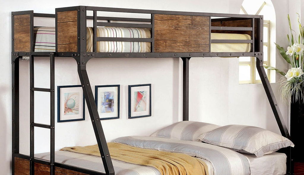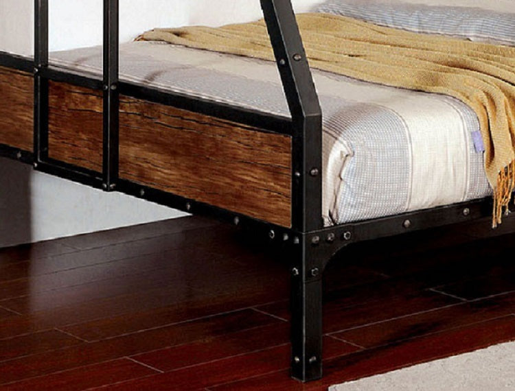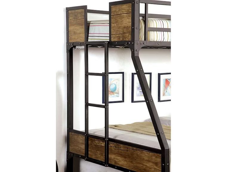 Elevate your bedroom with this Industrial Bunk Bed, masterfully crafted from a striking blend of metal and wood for enduring style and durability. Its space-saving design, complete with an attached ladder and sturdy guarded top bunk, ensures both functionality and safety. Perfect for optimizing small spaces, this black metal and wood bunk bed brings a bold, utilitarian aesthetic to any room.