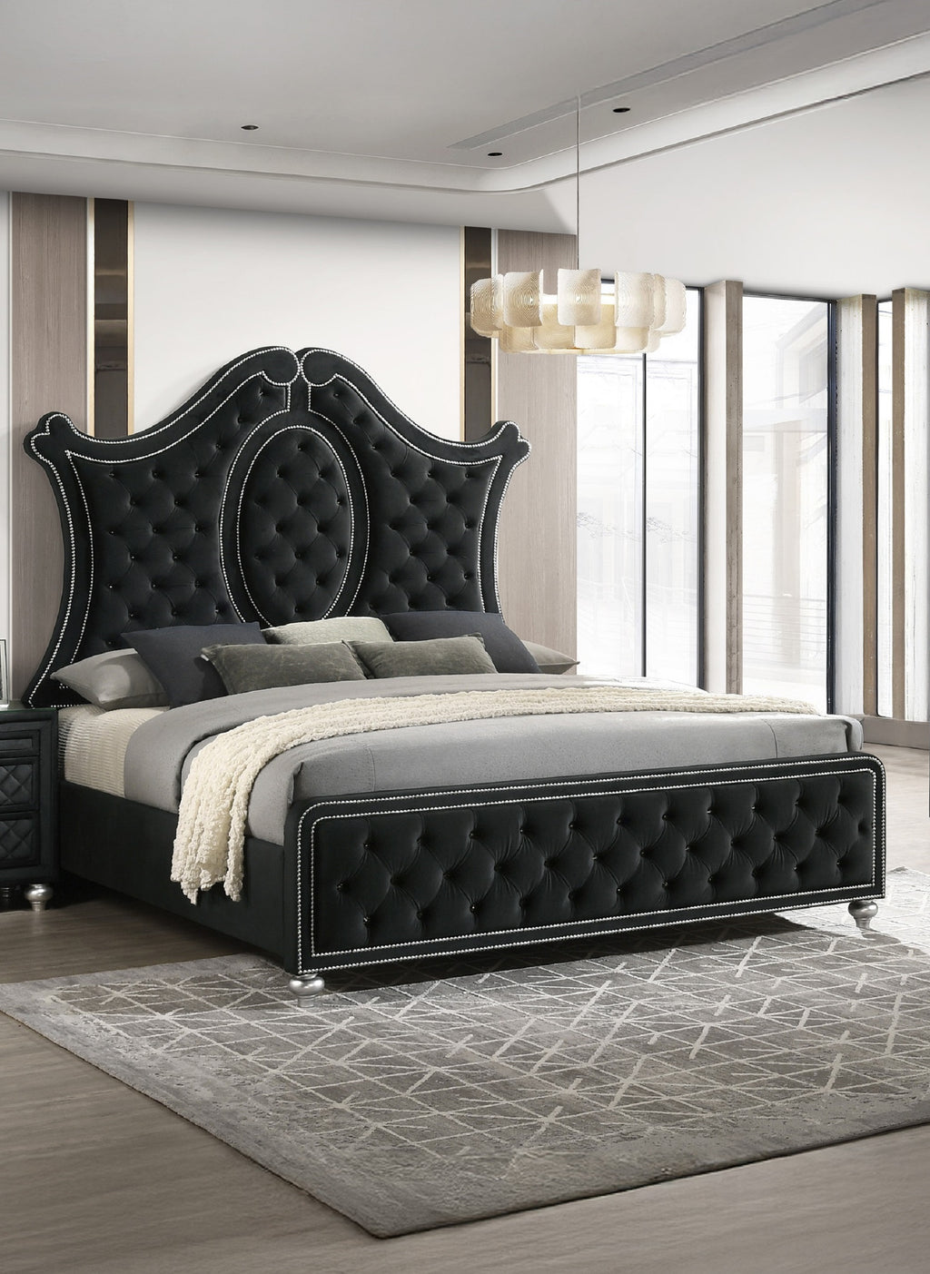 Elevate your master suite with this Glam and Luxury Black King Size Bed, featuring a stunning tufted headboard and intricate nailhead trim. Its modern yet timeless design, upholstered in luxurious fabric, creates a dramatic focal point in any bedroom. Experience unparalleled style and durable craftsmanship, making this bed the ultimate statement piece for a sophisticated retreat.