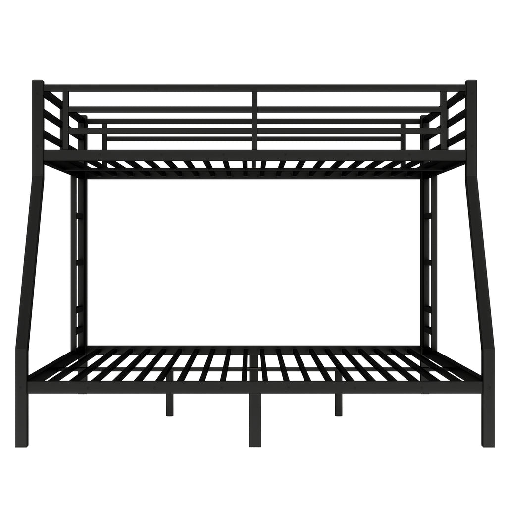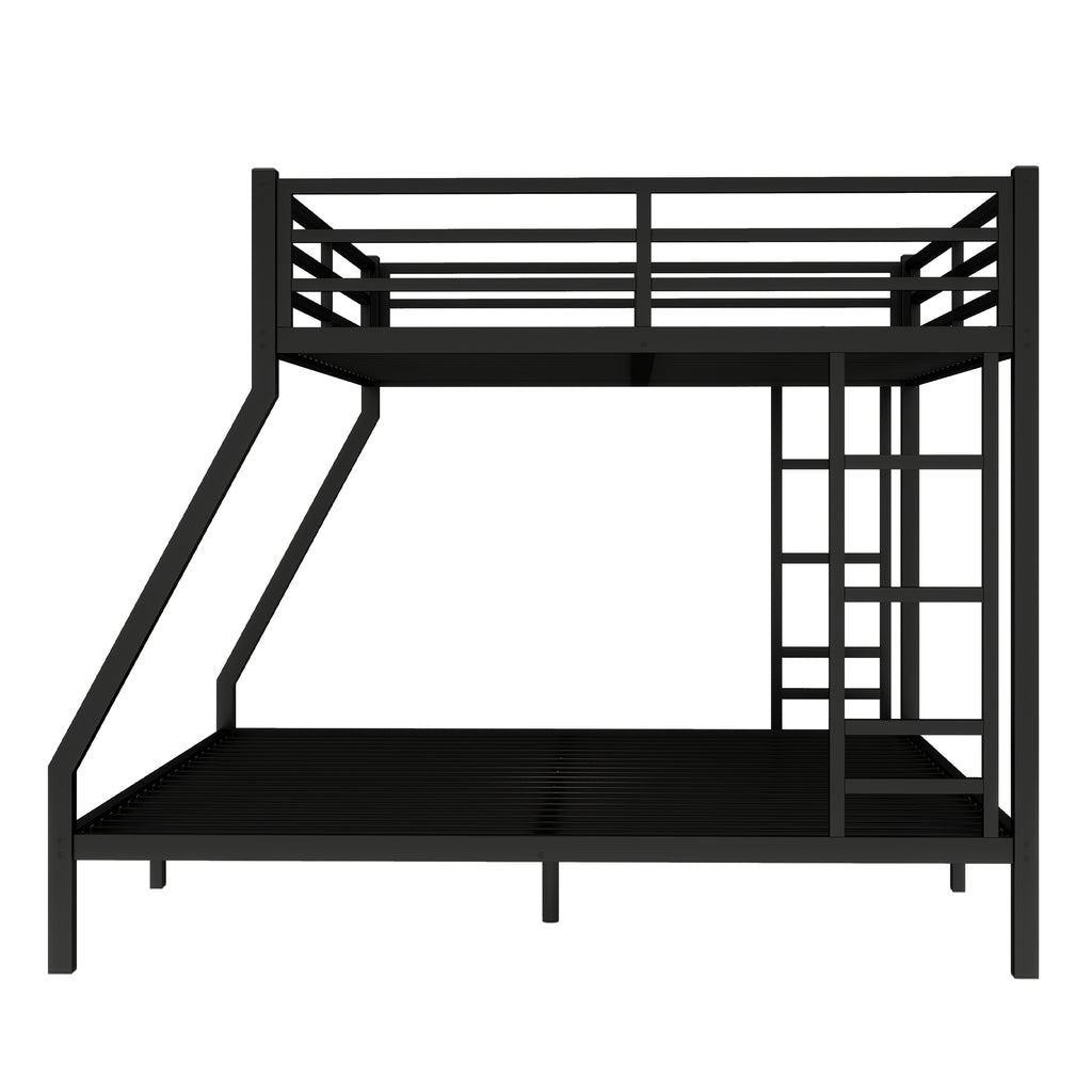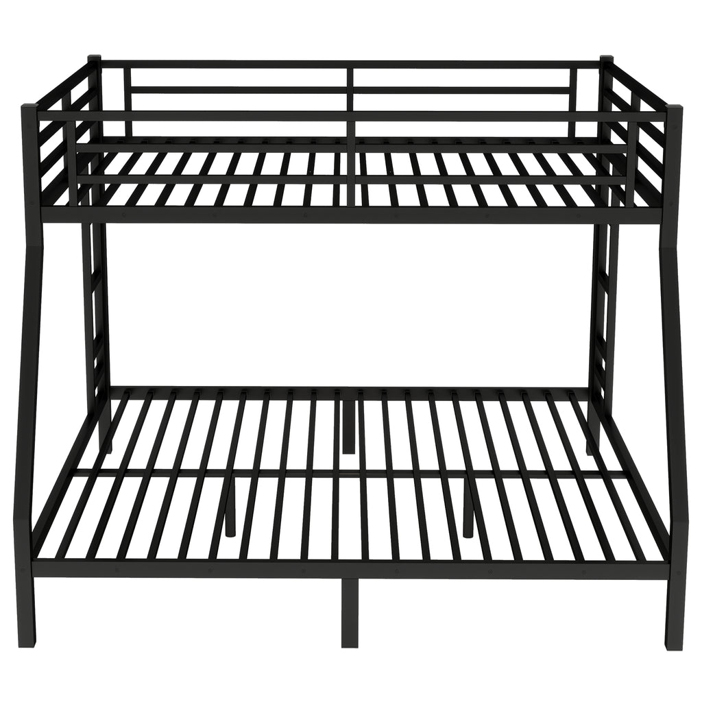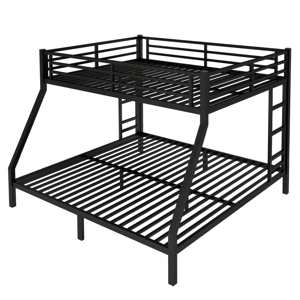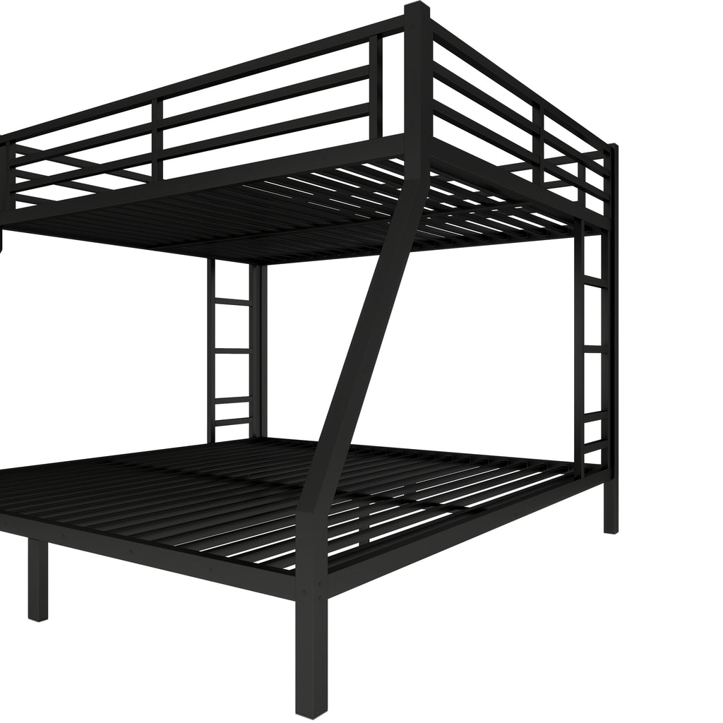 Maximize space and style with our sturdy Queen over King metal bunk bed, featuring a robust, noise-free design for ultimate stability and sleep comfort. Engineered with reinforced safety rails and convenient 2-side ladders, this durable black bunk bed ensures secure sleeping for both levels. Benefit from ample 9.8-inch under-bed storage, efficiently decluttering your room while providing a space-saving solution.