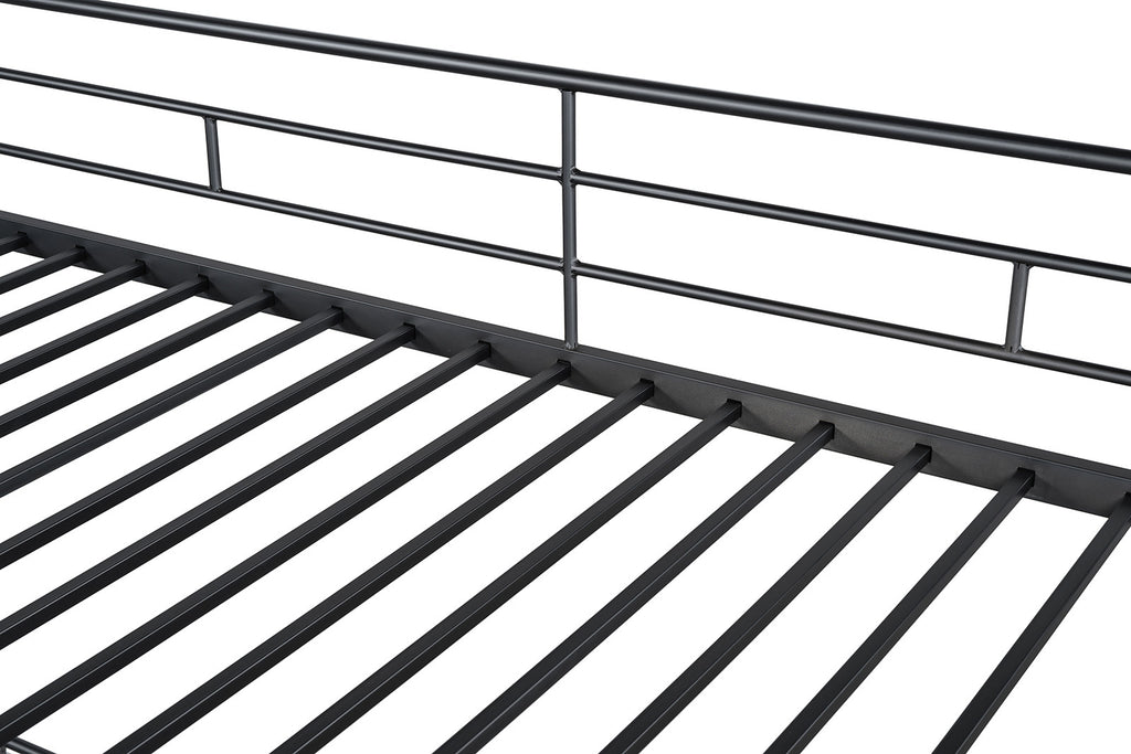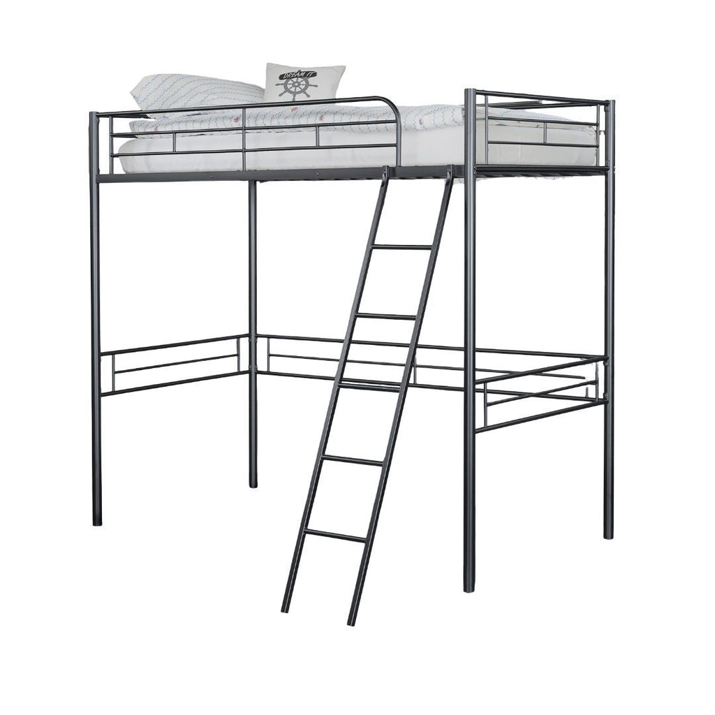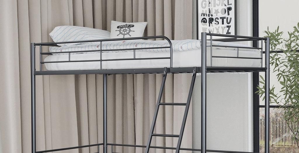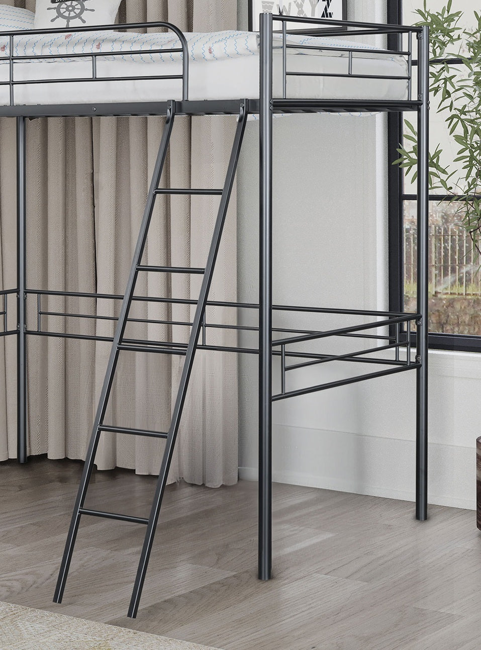 Modern twin-size loft bed crafted from robust black-finished metal tubing. With its built-in ladder, it elevates the sleeping area to free up floor space below—perfect for a desk, storage, or play zone in compact rooms.