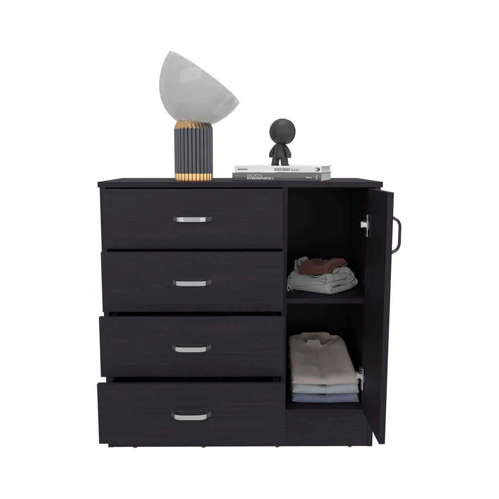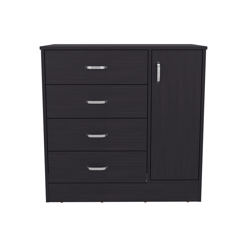 - 4 drawers + 1 cabinet door configuration offers versatile storage for everything from folded clothing to bulkier items like bags or linens.