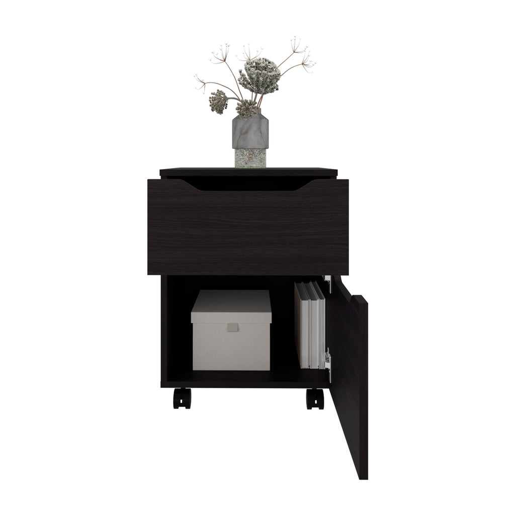Black Modern Nightstand: Open Shelves, Door Bedside Storage