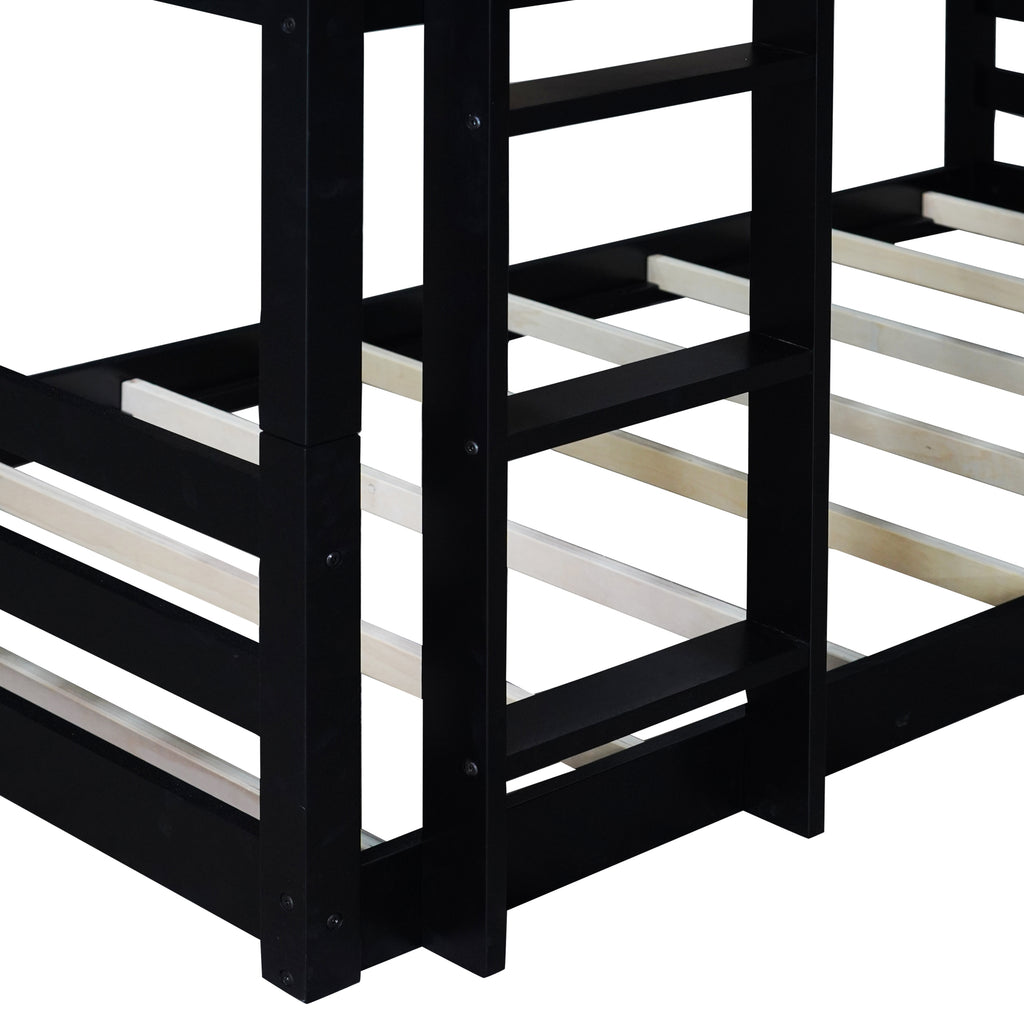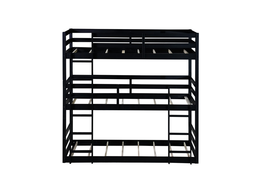 Triple Rubber Wood Bunk Bed with Two Built-in Ladders, Guardrails