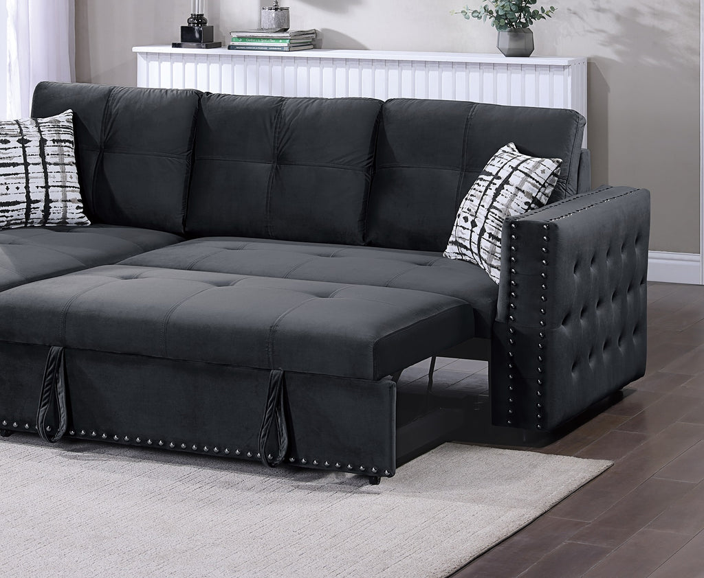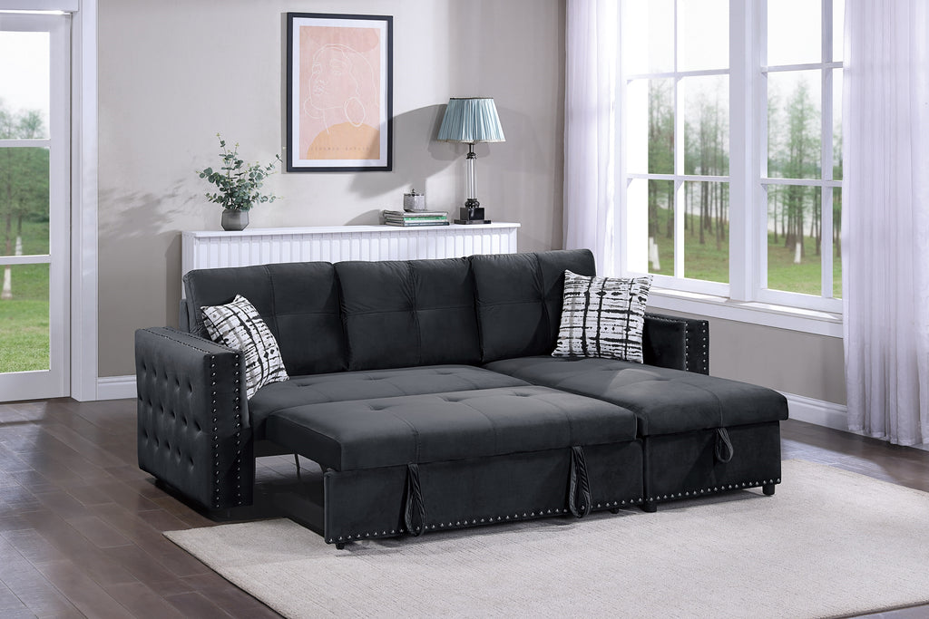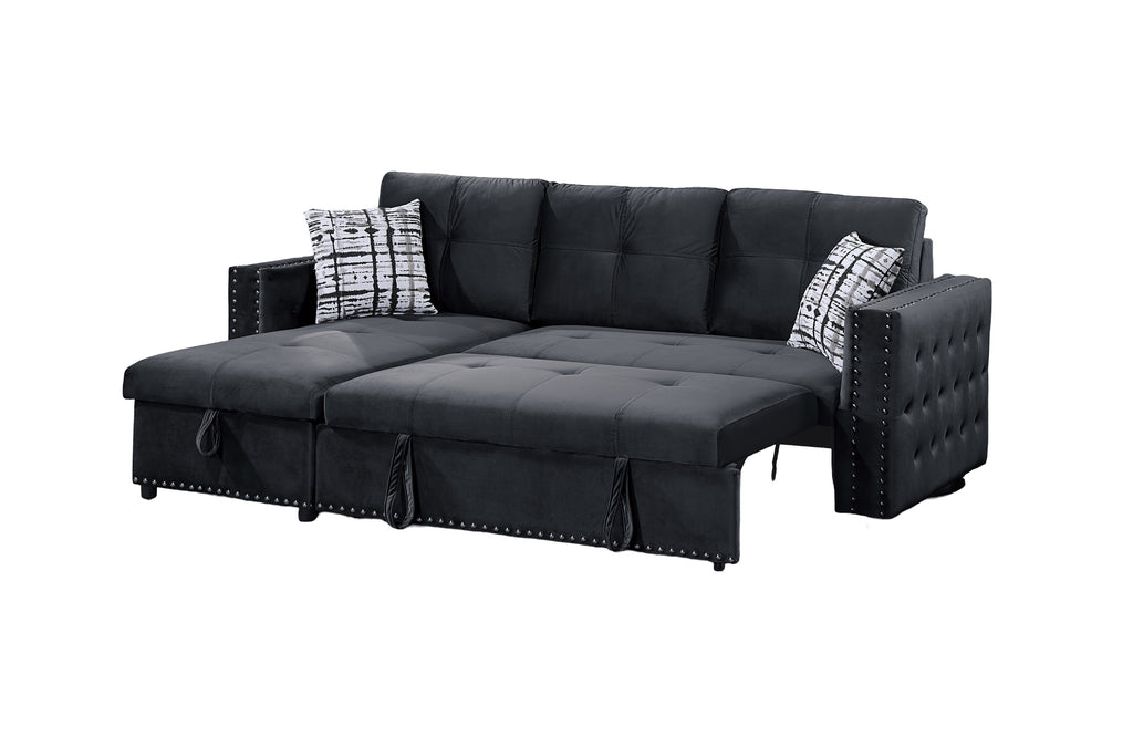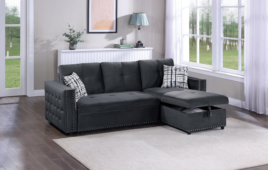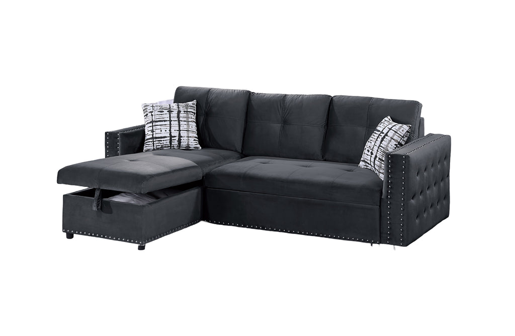 This exceptional piece seamlessly combines comfort, functionality, and contemporary design to elevate your living space. Choose the configuration that suits your space and preferences with the reversible chaise. The reversible chaise is not just a comfortable lounging spot – it also features convenient storage underneath. Keep your living space organized and clutter-free with this hidden storage compartment, perfect for blankets, pillows, or any other essentials. Enjoy the luxury of tufted seats and back cushions that not only provide plush comfort but also add a touch of sophistication to your decor. The square arms are adorned with nail head trim, adding a touch of elegance to the overall design. Diamond button tufting on the side further enhances the aesthetic appeal. To complete the look, we've included two accent pillows with captivating designs. These pillows add a pop of color and personality to your sectional, creating a cohesive and stylish living space.