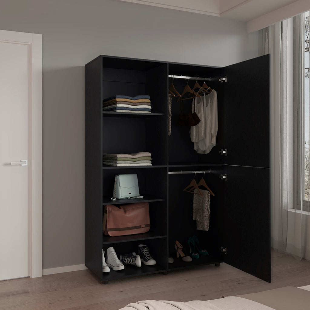- Spacious design: Two large compartments with hanging rods and open shelving.