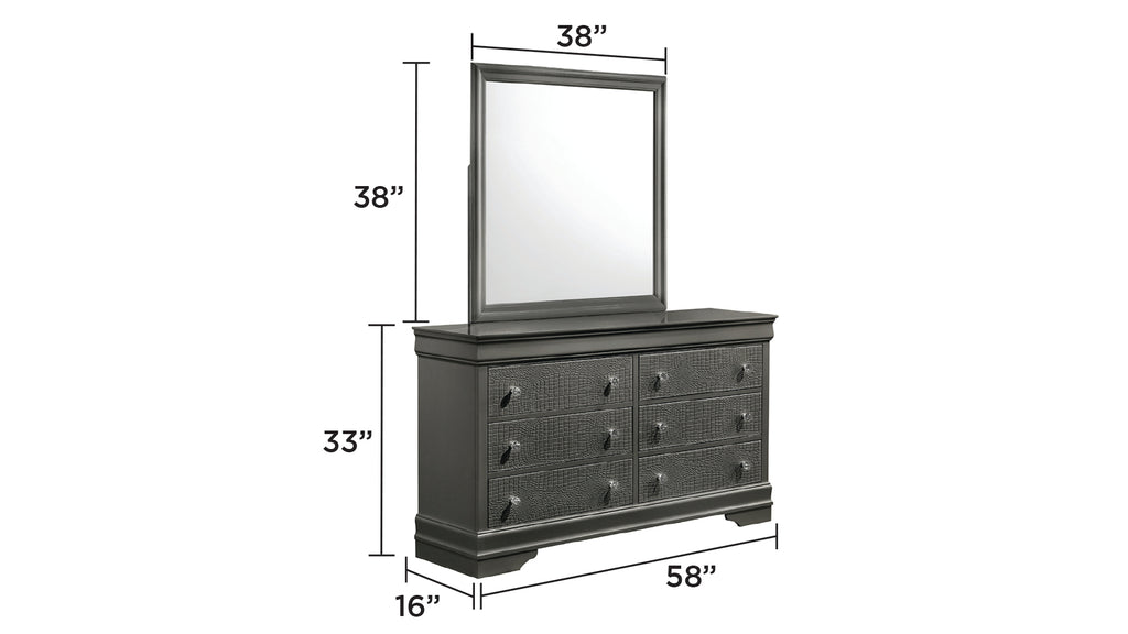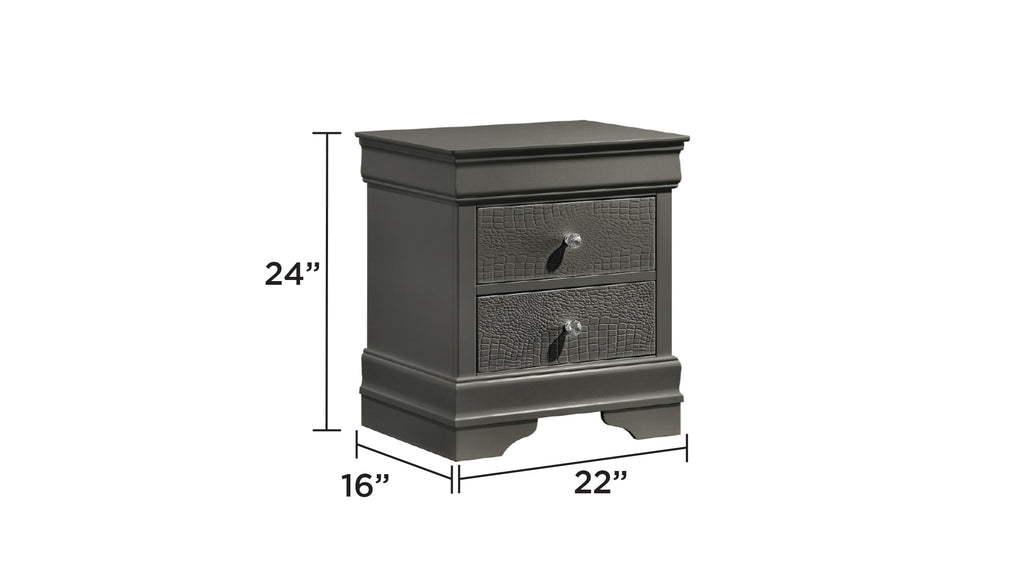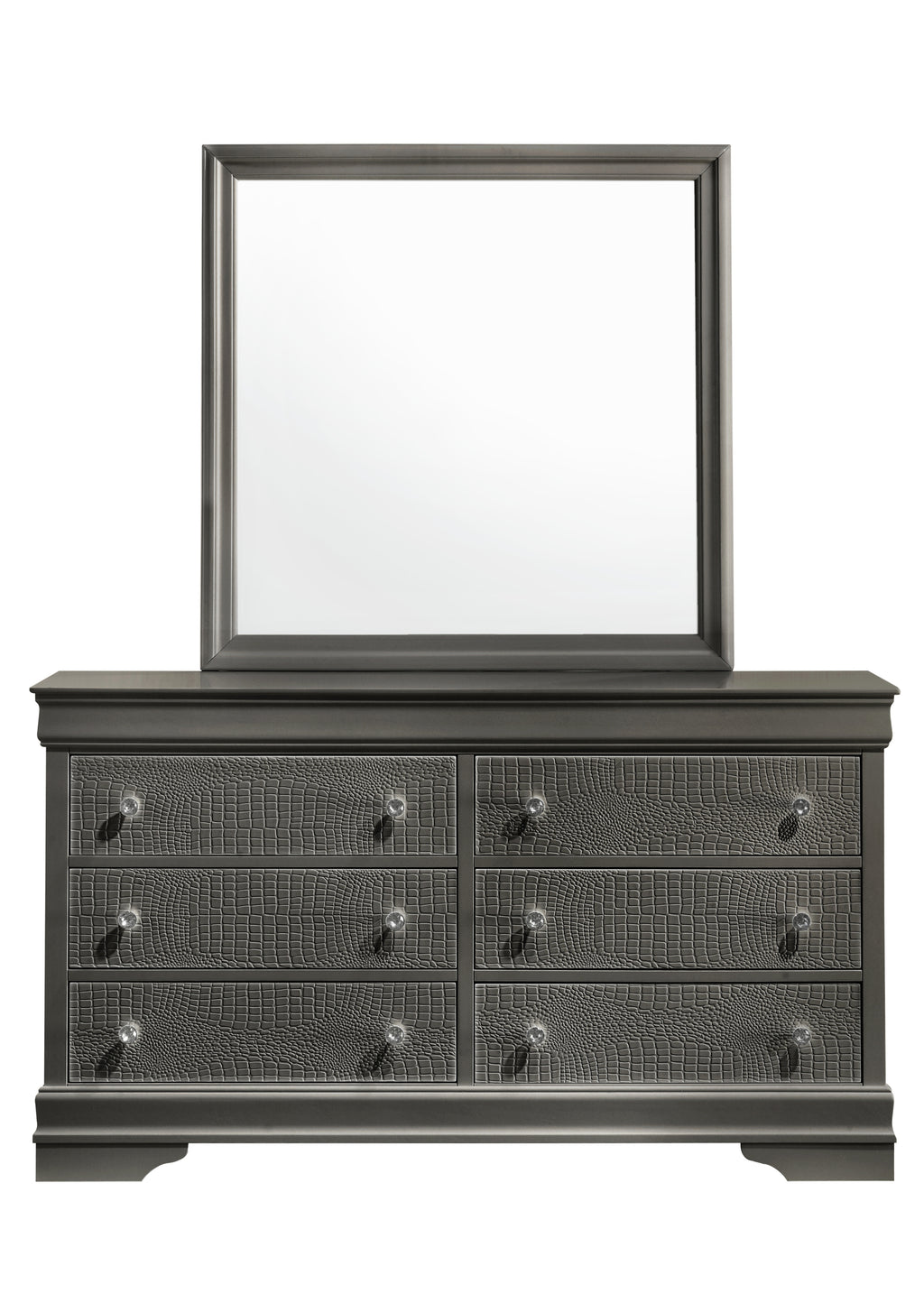 Discover the epitome of modern elegance with this comprehensive bedroom set, designed to bring a touch of luxury and functionality to your personal space. Available in both 4-piece and 5-piece configurations, this set caters to different spatial and storage needs. Each piece features a sleek, uniform finish, offering a cohesive look that complements any decor style. The 4-piece set includes a bed, dresser, mirror, and nightstand, while the 5-piece set adds a chest for extra storage. All pieces showcase matching textured surfaces and crystal-like knobs, blending sophistication with practical design. To suit various preferences, this bedroom set is available in gray gunmetal or white, allowing you to choose the perfect color to complement your decor.