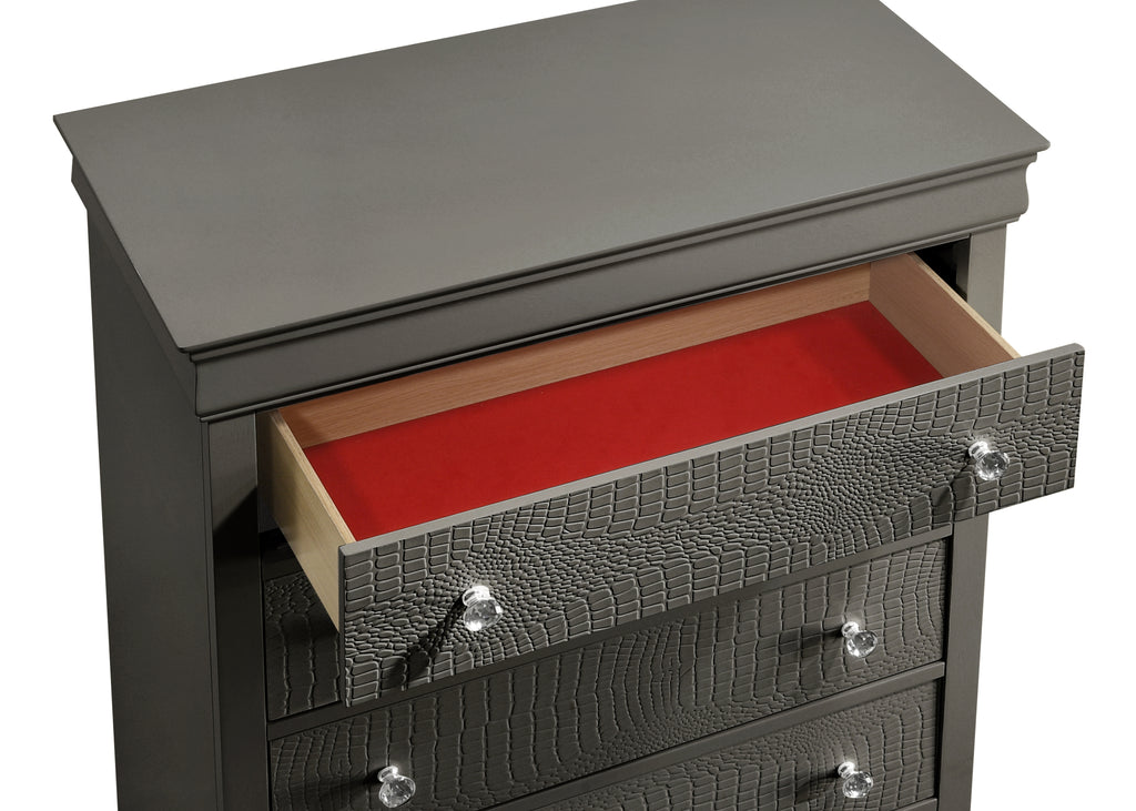 - Luxurious Touches: The bed boasts an upholstered tufted headboard with LED lighting, while the top drawers of the dresser, nightstand, and chest are lined with red velvet.