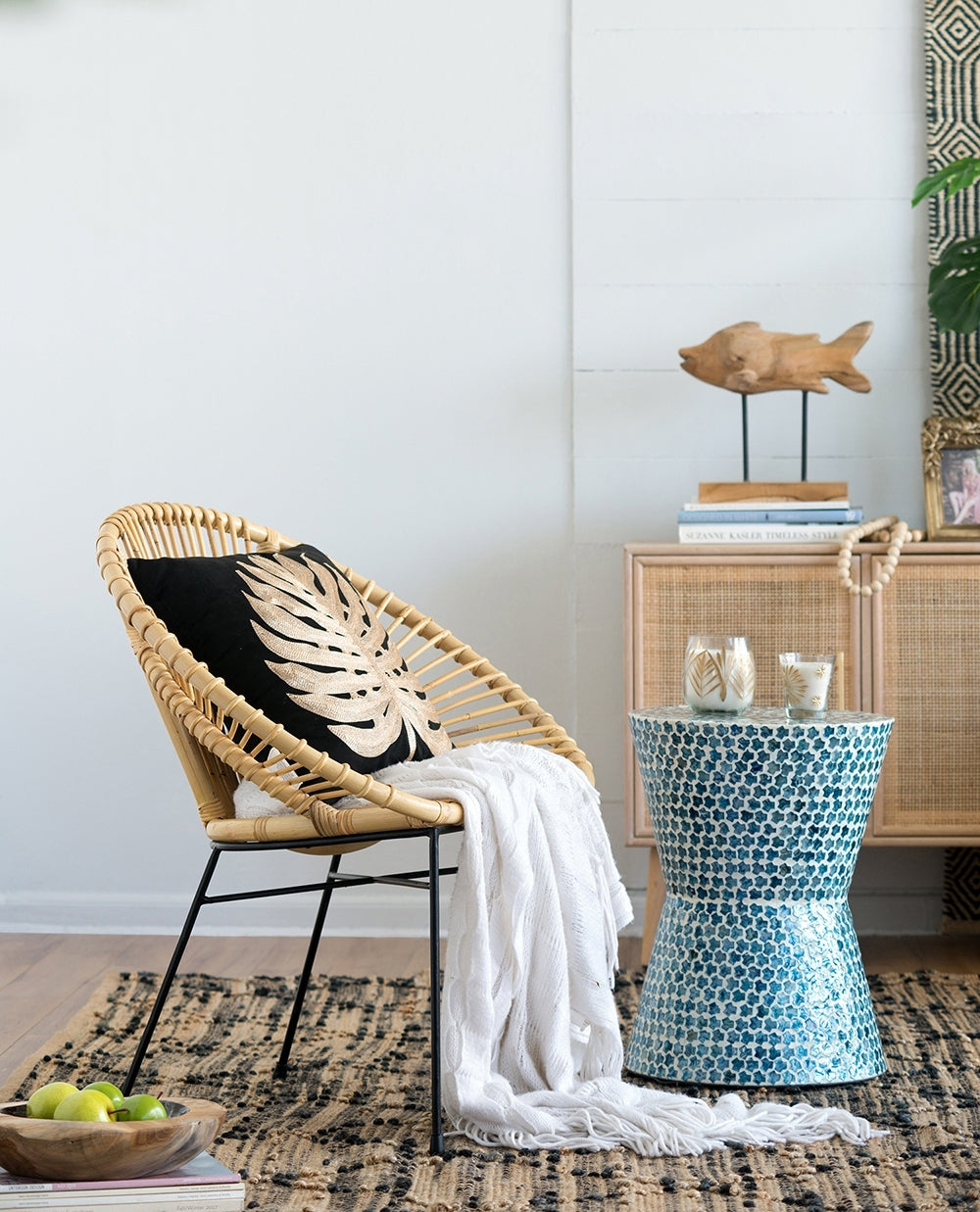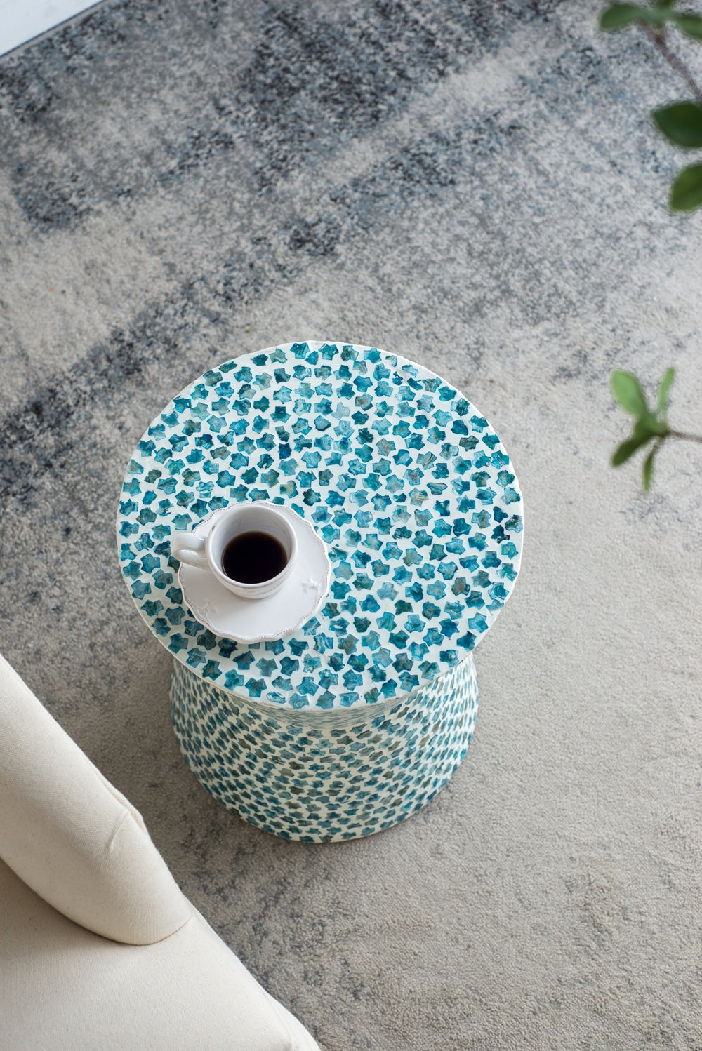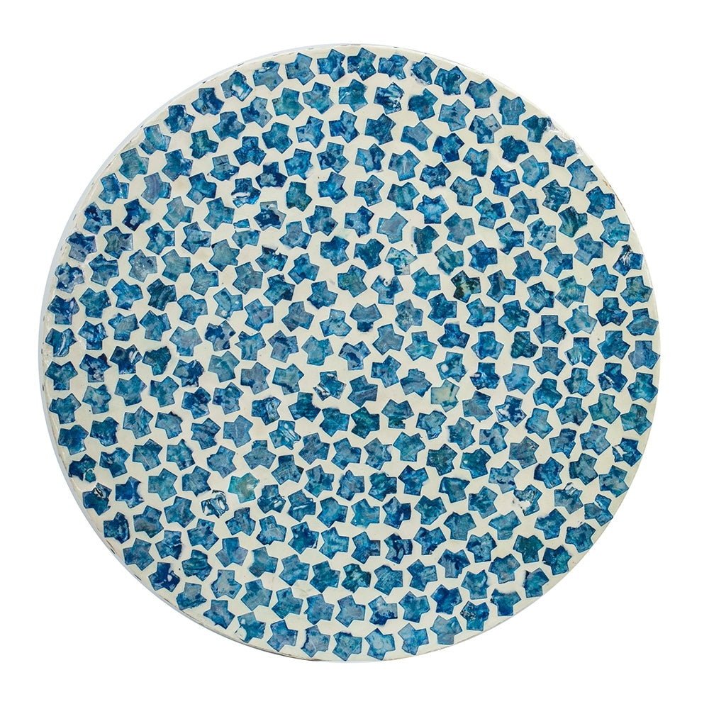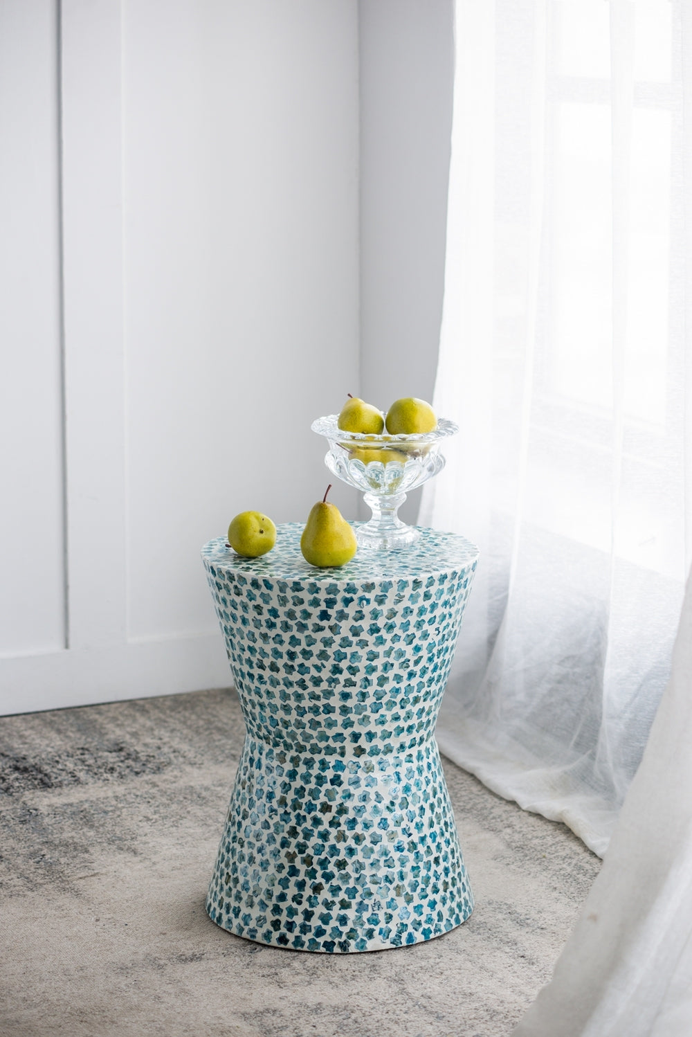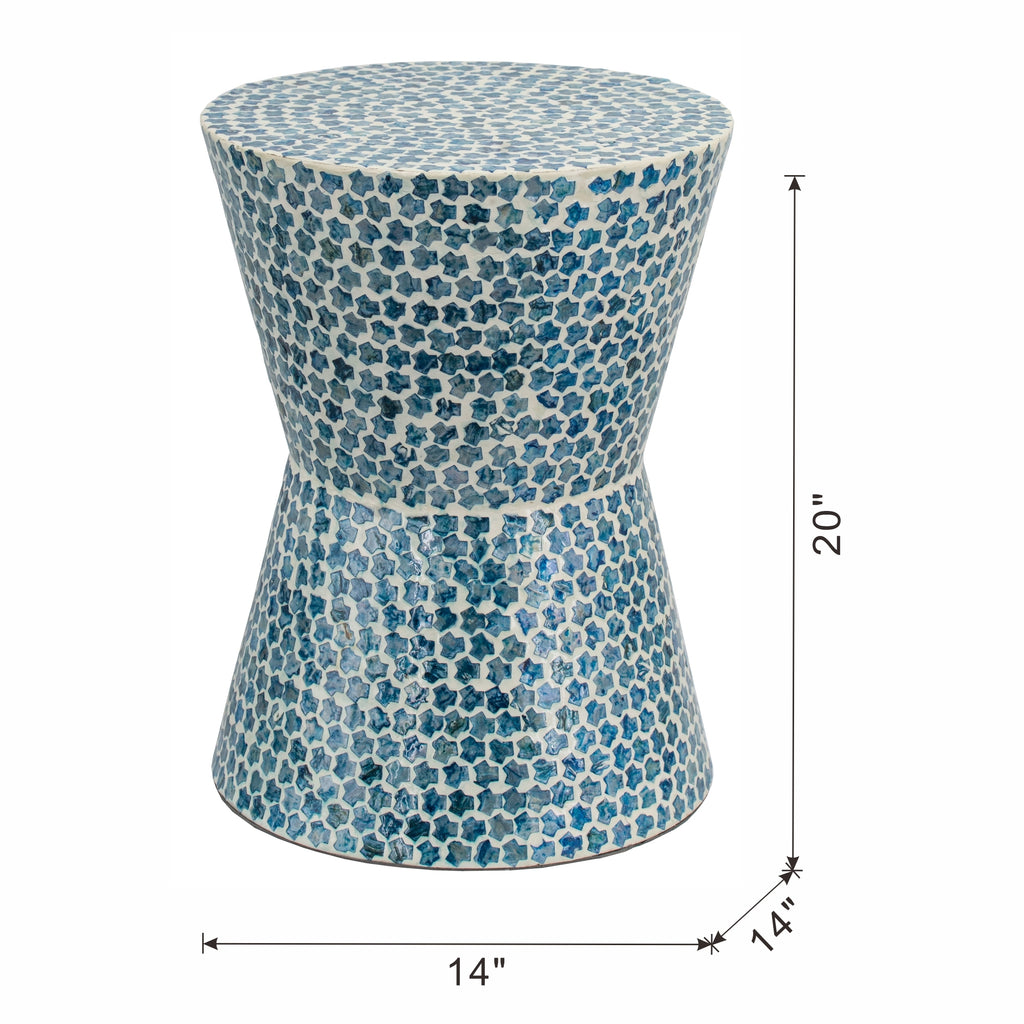 - A classy piece with bohemian charm, this tapered round stool features a Capiz inlay along its blue frame.