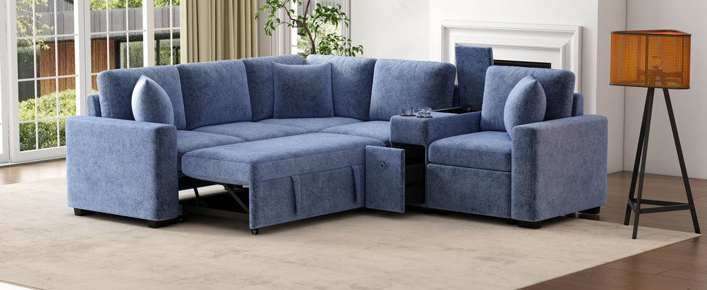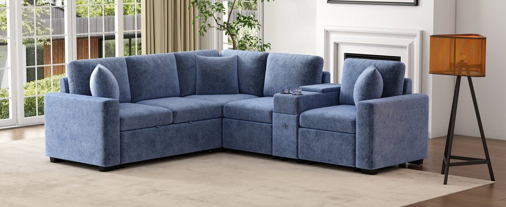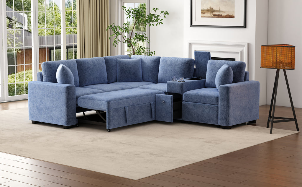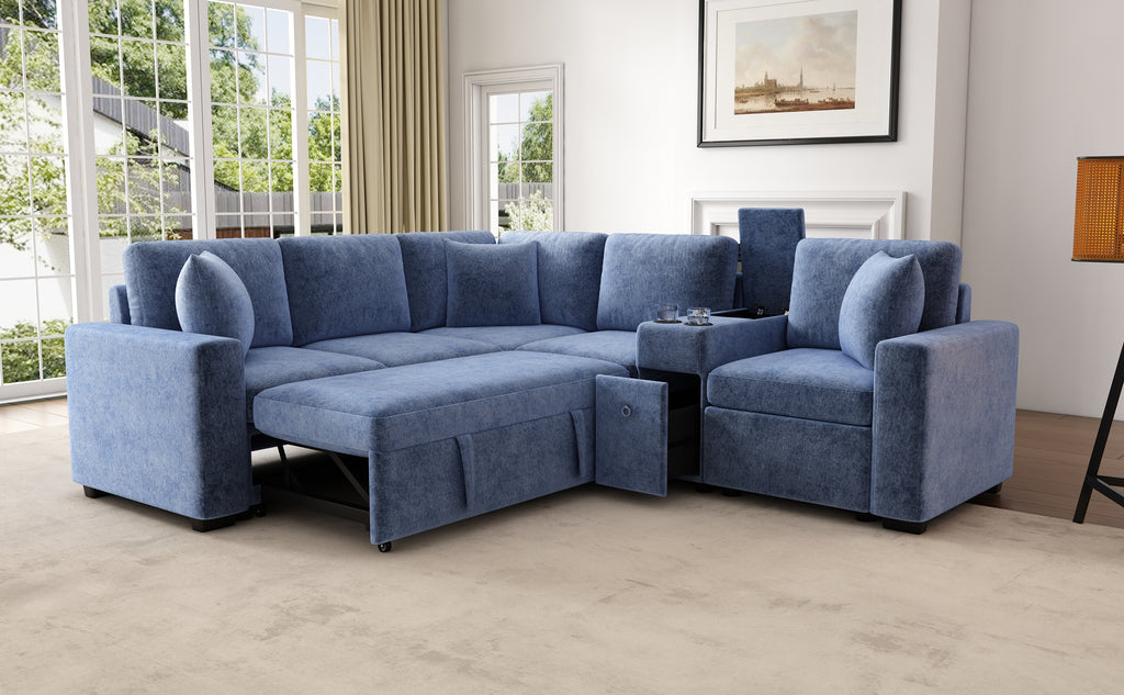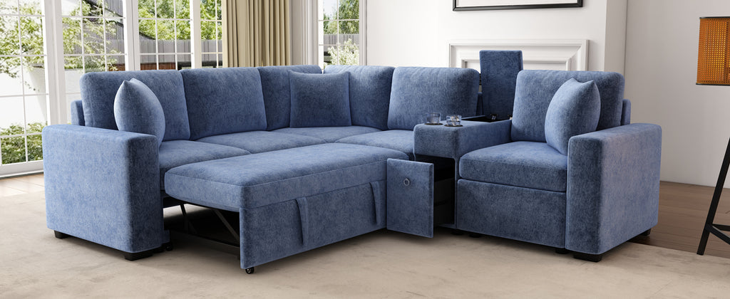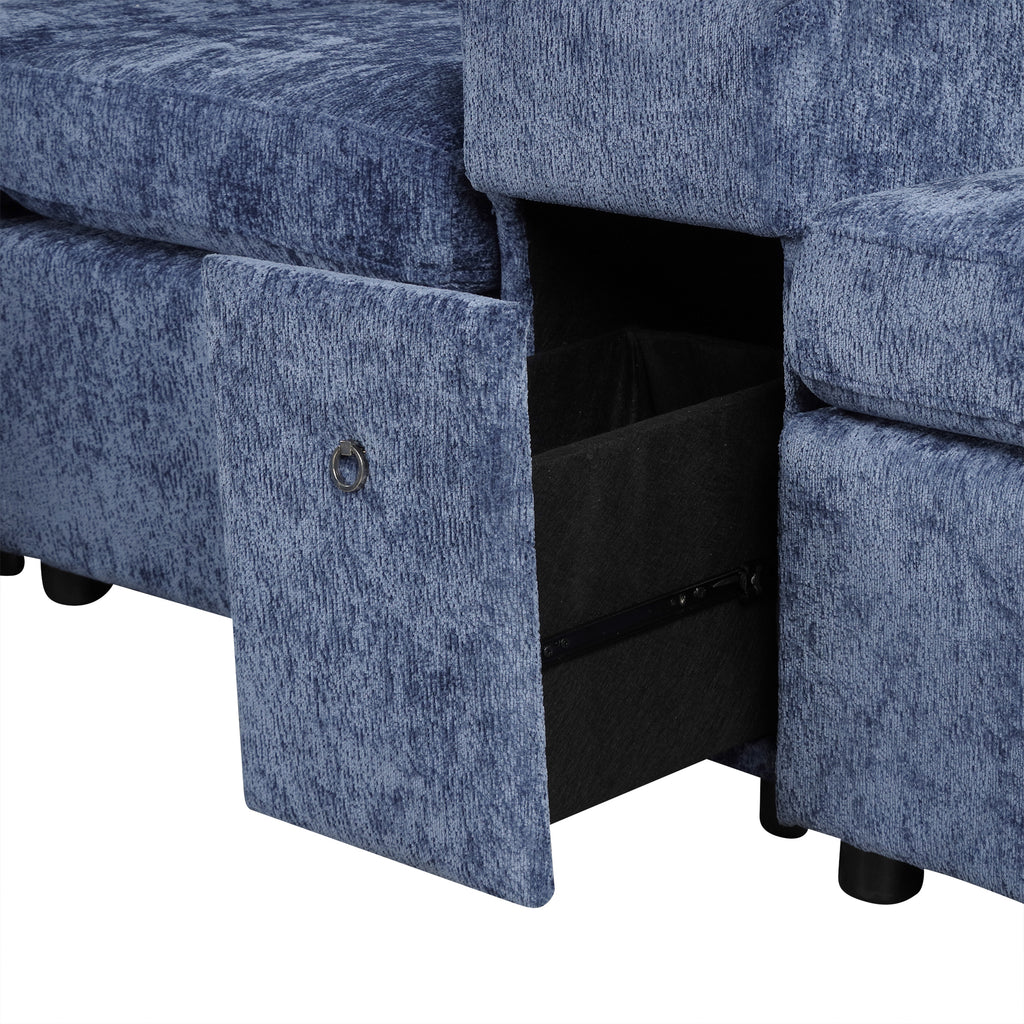This versatile modular pull-out sofa offers a perfect blend of functionality, comfort, and style. Its customizable design allows for three different configurations, while the effortless pull-out bed provides a spacious 67”W × 44.5”D sleeping area, making it ideal for guests and multifunctional spaces. Smart storage solutions, including a hidden armrest compartment and spacious drawer, help keep essentials organized and clutter-free. The built-in cup holders add convenience, while adjustable, removable pillows enhance comfort. Wrapped in luxurious chenille fabric, this sofa offers a soft, breathable, and durable upholstery, making it the perfect addition to any modern home.