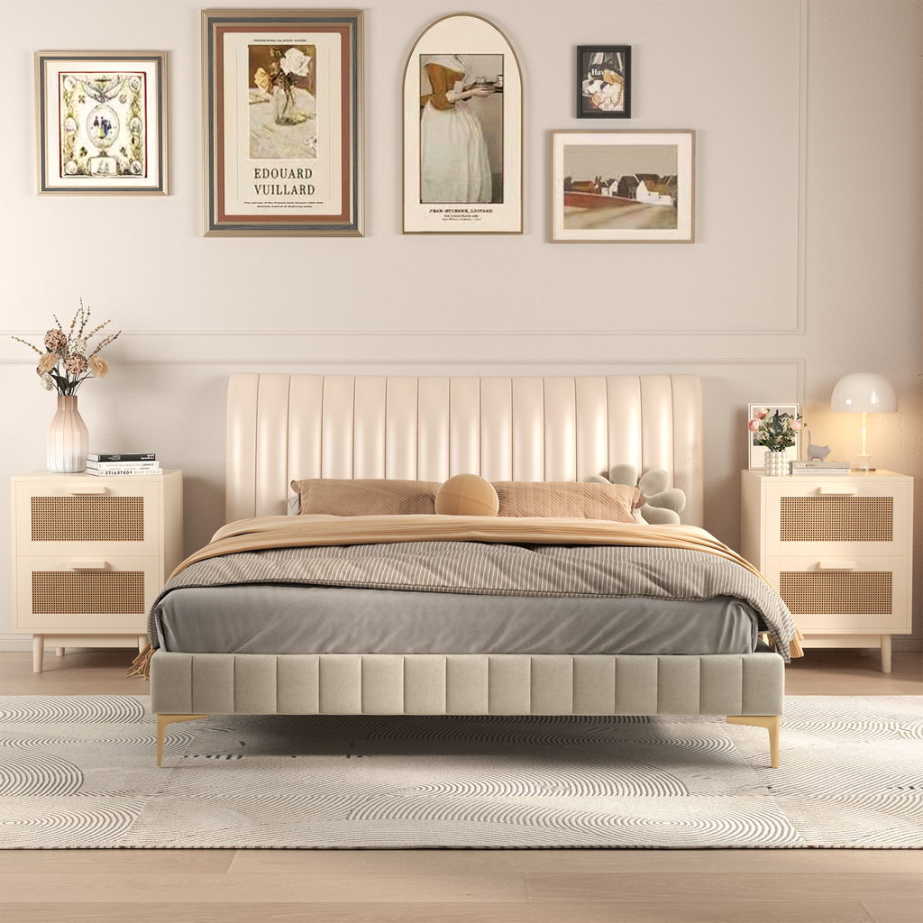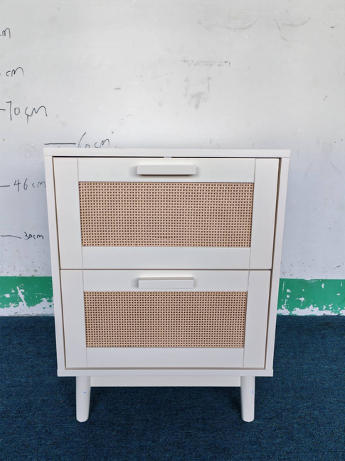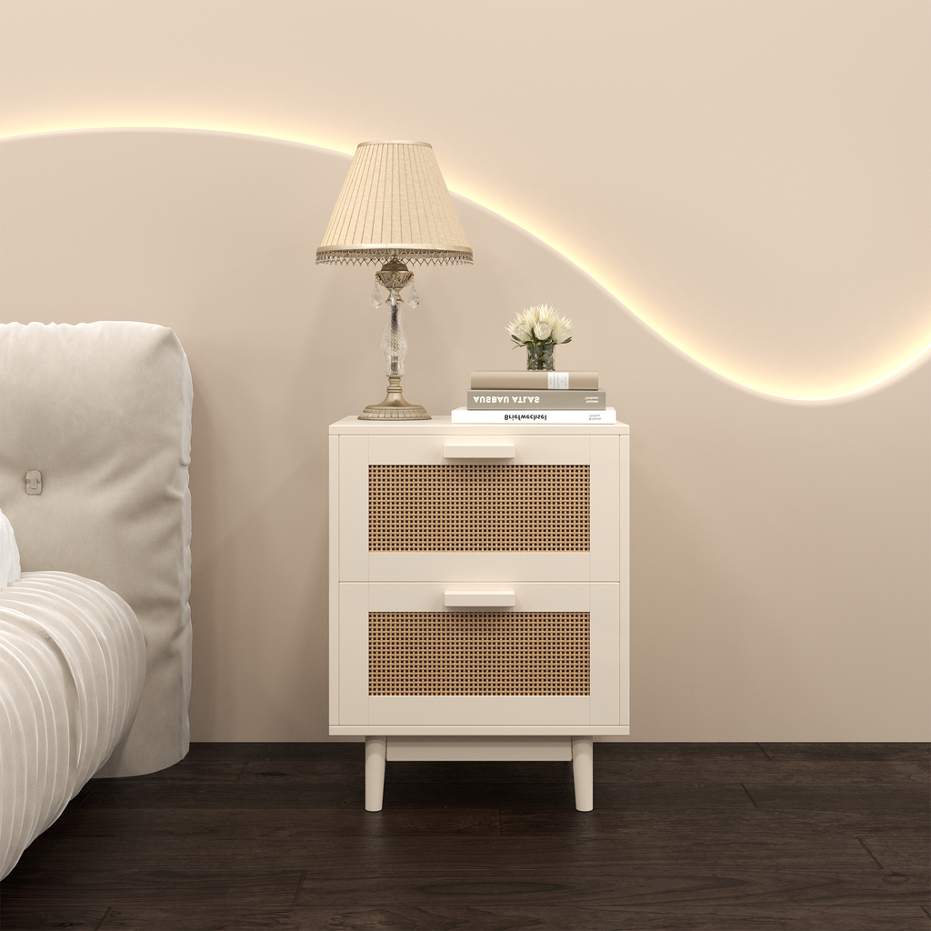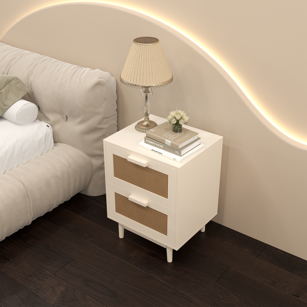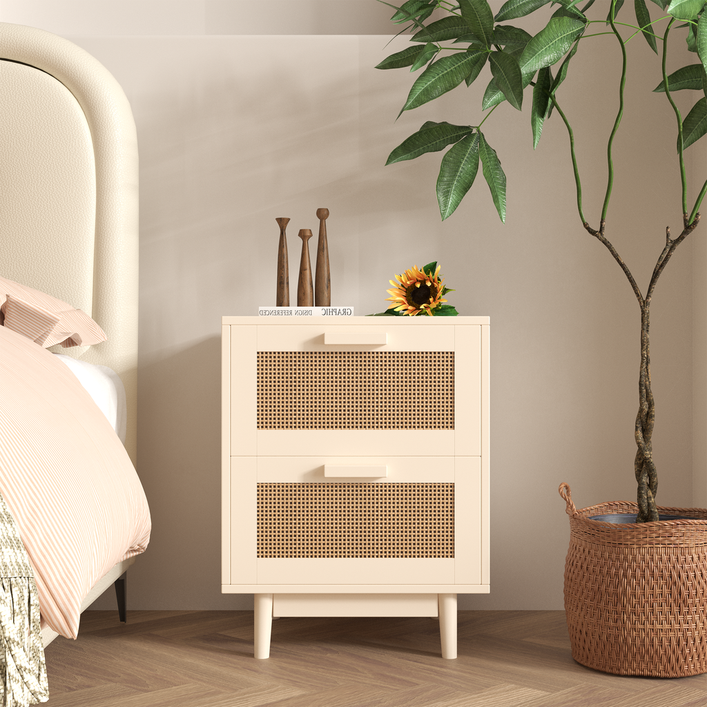 - Featuring expertly crafted rattan-style sliding drawers and a natural wood-tone finish, this bedside table combines functionality with aesthetic appeal. Though the rattan is synthetic, it mimics the texture and charm of natural materials, ensuring durability and easy maintenance. This versatile piece functions as a nightstand, bedside cabinet, or storage unit, meeting various bedroom storage needs. With clean lines and a timeless design, it complements a range of interior styles, adding understa