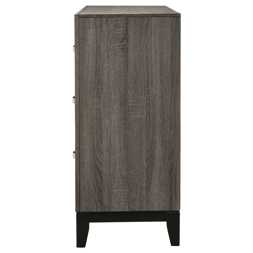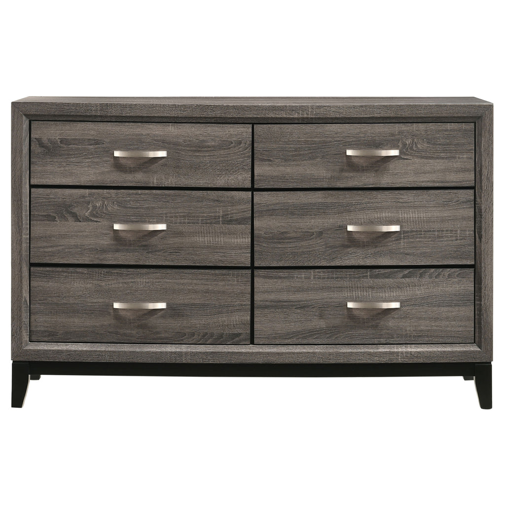 Closets feel less crowded with this gray oak six-drawer dresser, a straightforward piece with wide storage for folded clothes and accessories. Nickel-finished pulls brighten the two-tone face, and linear grooves outline each drawer to add dimension while smooth glides keep mornings moving.