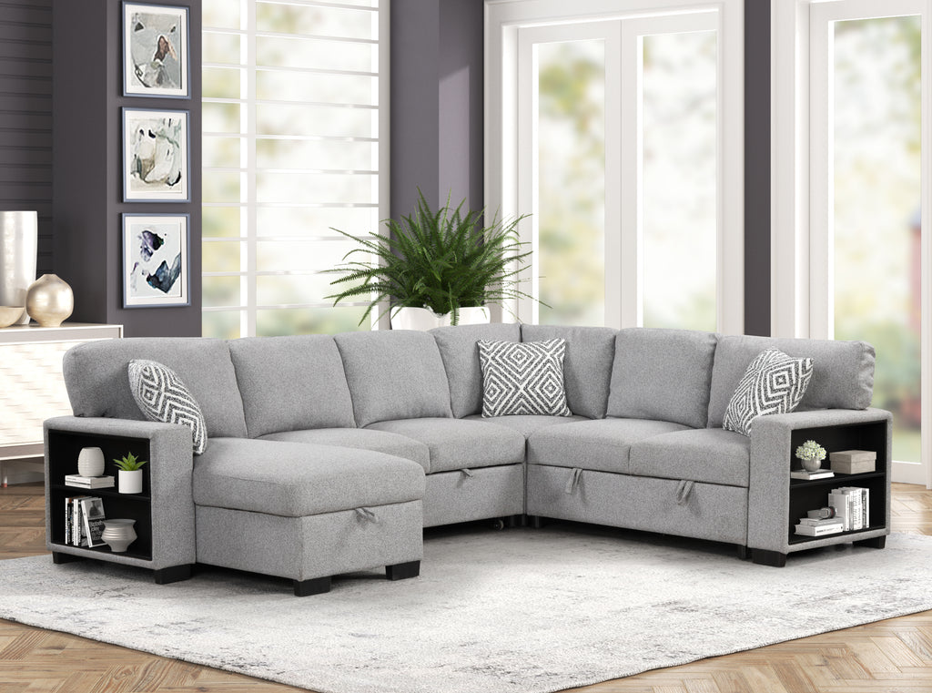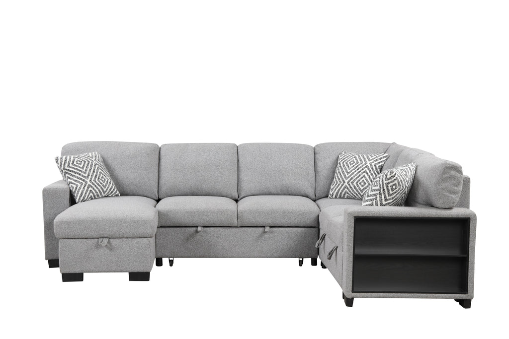 This elegant sectional sofa offers a perfect blend of comfort, style, and multifunctionality, making it a standout piece in any modern living room. Upholstered in soft yet durable fabric, this sectional provides a cozy and inviting seating experience while ensuring longevity. Its thoughtfully designed layout includes spacious storage compartments within the reversible chaise and loveseat, offering convenient solutions for keeping blankets, pillows, and other essentials neatly organized. The reversible chaise can be moved to either side, providing flexibility to fit your room layout perfectly. The sectional is equipped with bookshelf-style armrests on each end, providing easy-access storage for books, magazines, or decorative items, adding a unique touch to its design. Additionally, the sectional features a practical drop-down table, complete with built-in cup holders and USB ports, making it easy to enjoy drinks, snacks, and stay connected without leaving your seat. To top it off, this sectional includes a built-in sofa bed, providing a convenient solution for overnight guests or maximizing space in compact living areas.