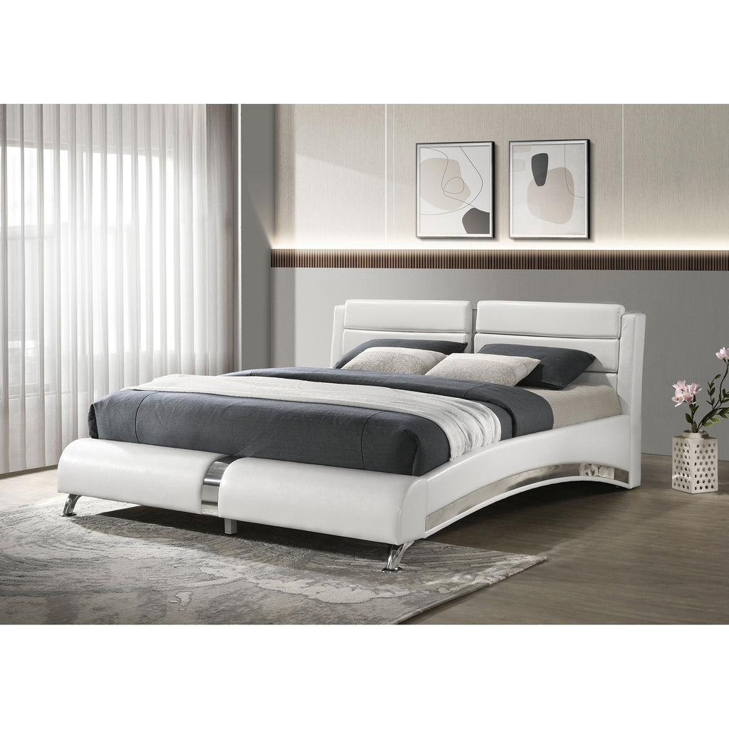 This sleigh bed features a fresh, timeless finish that brightens any bedroom, enhanced by softly padded upholstery in premium fabric or leather for added comfort. Its gracefully curved headboard and footboard offer classic elegance, while the slatted design promotes ventilation and adds a touch of rustic or modern charm.