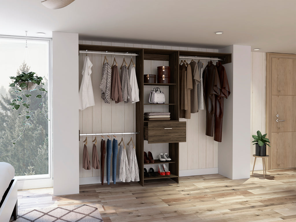 This cabinet features three metal rods for strong support and stability, along with four shelves for ample organization of books, decor, and other items. It includes a single drawer for smaller essentials, and its deep dark walnut finish adds a rich, luxurious appearance, enhancing warmth and sophistication.
