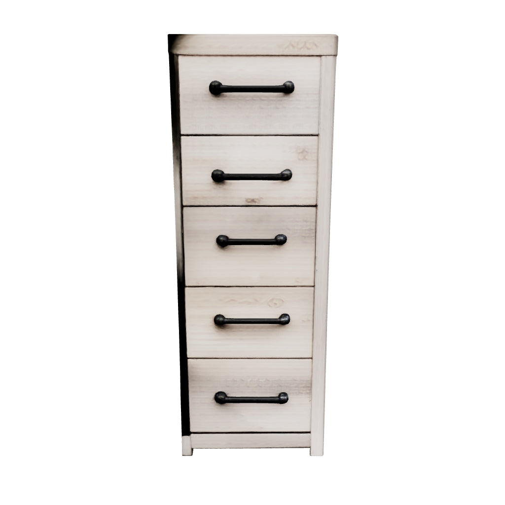 What a delightful take on rustic industrial style. Whether modern loft or modern farmhouse, this narrow chest makes itself at home. The wispy whitewash palette enhances without covering the grain for that weathered look you crave. Designed to accommodate smaller spaces, its linear profile and modern handles are a refreshing change of pace.