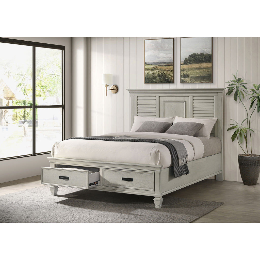 Drawer storage at its footboard enhances the function of this fashionable platform storage bed with a rustic lightly wire-brushed finish. With a classic transitional style influenced by mission-inspired designers, its extra-high louvered headboard with a center panel and ornate tapered block feet offers a charming effect perfect for a casual bedroom.