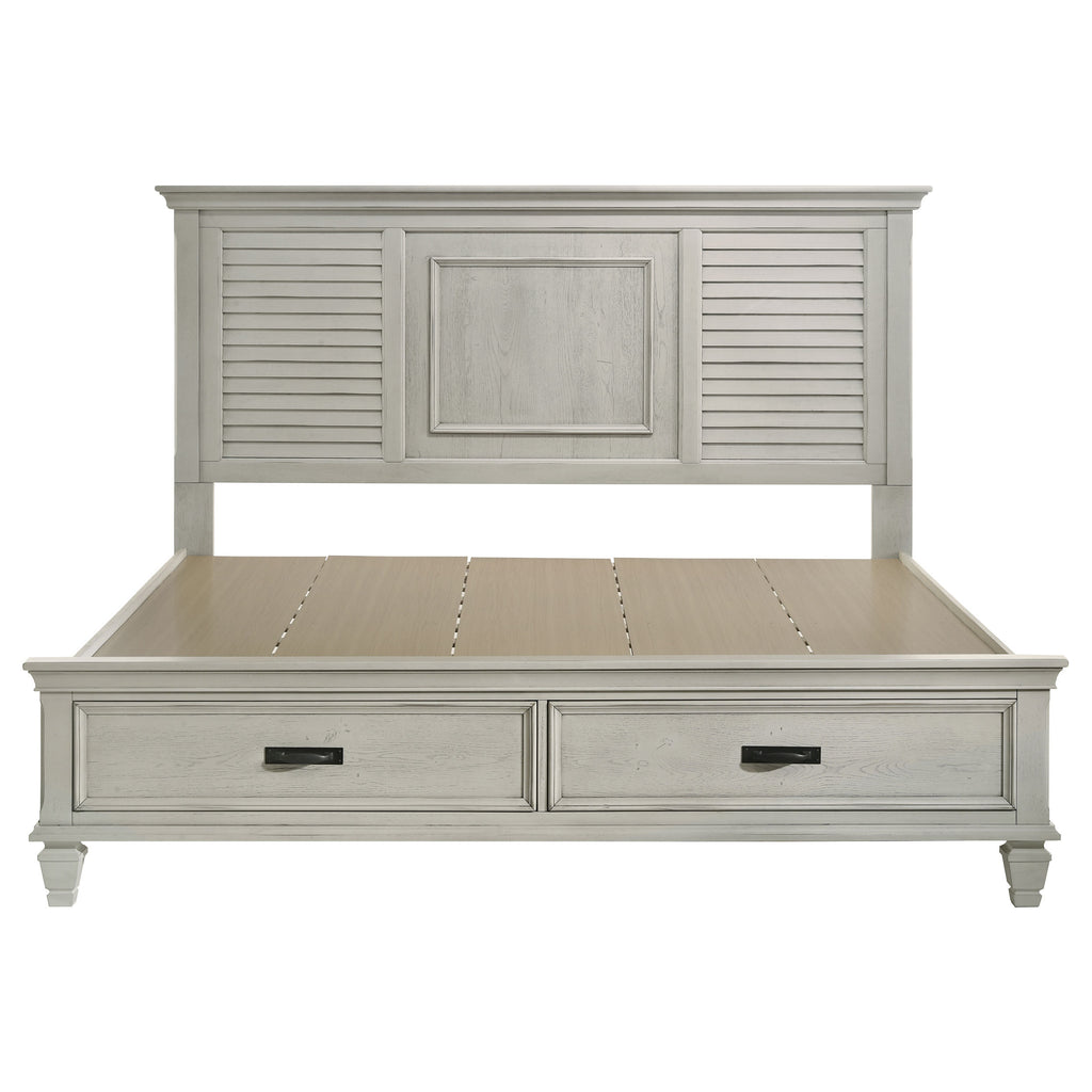 Elevate your bedroom with this Farmhouse King Platform Bed, featuring a stylish distressed white wood finish and a high louvered headboard. Enjoy convenient footboard drawer storage, perfect for a clutter-free space in your coastal-inspired sanctuary. Its robust platform system accommodates most mattress types, offering both beauty and functionality.