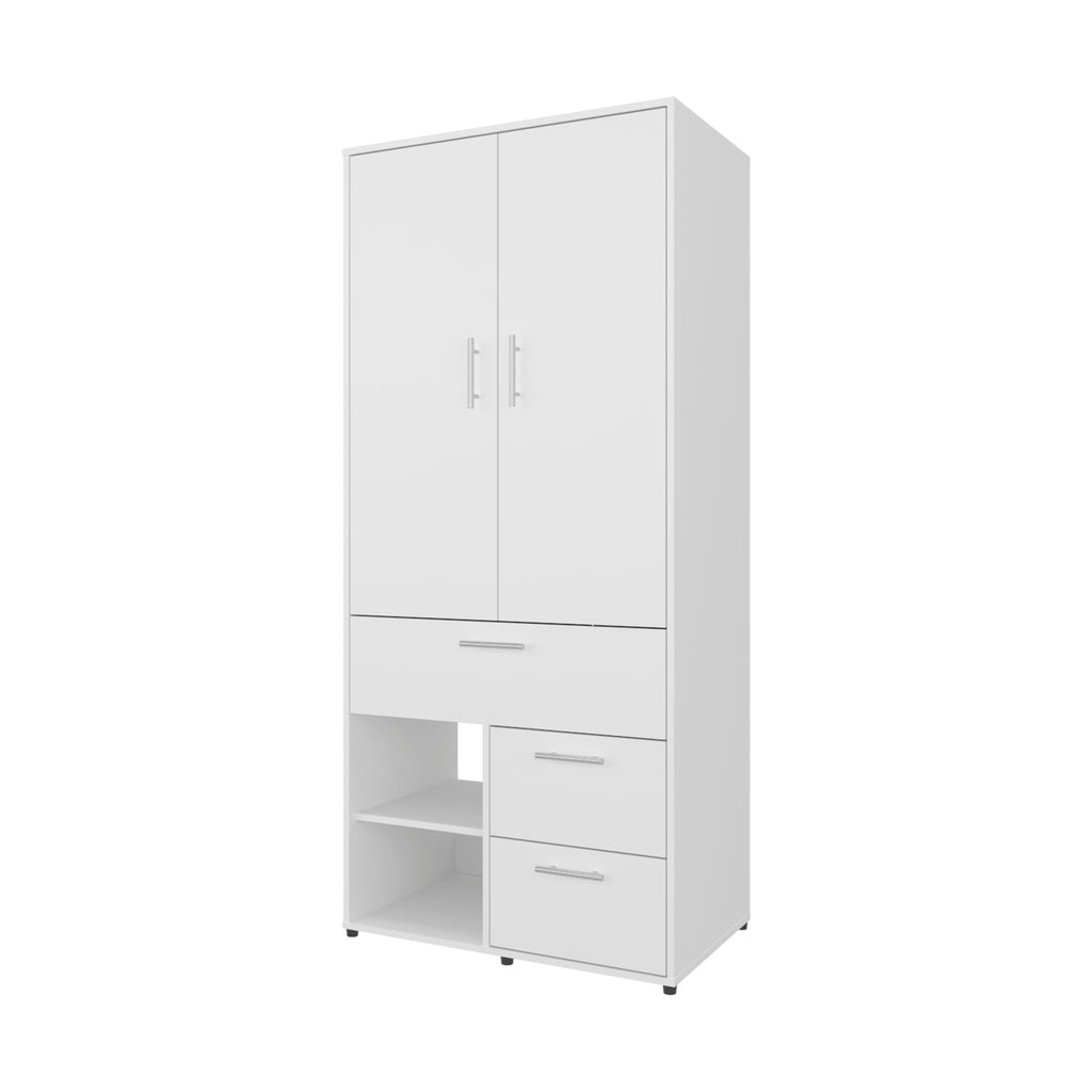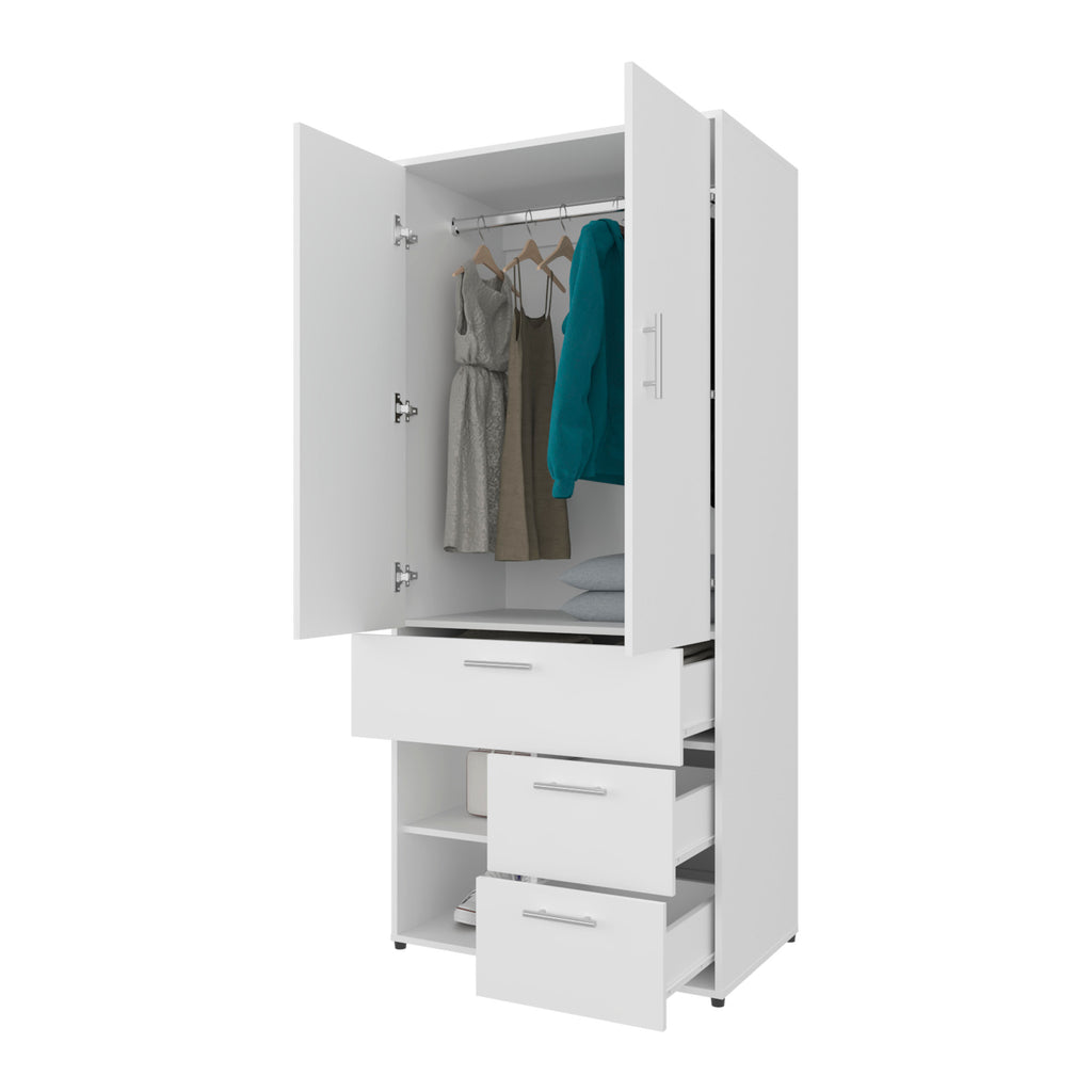 This versatile and compact wardrobe is designed to maximize your bedroom storage. It features a spacious upper cabinet with double doors and a sturdy hanging rod, perfect for keeping clothes wrinkle-free. Below, three smooth-gliding drawers provide easy access to folded garments, accessories, or linens. Additionally, open side shelves offer extra space for organizing shoes, boxes, or decorative items. Its modern structure and functional layout make it a smart choice for small spaces or minimalist interiors.