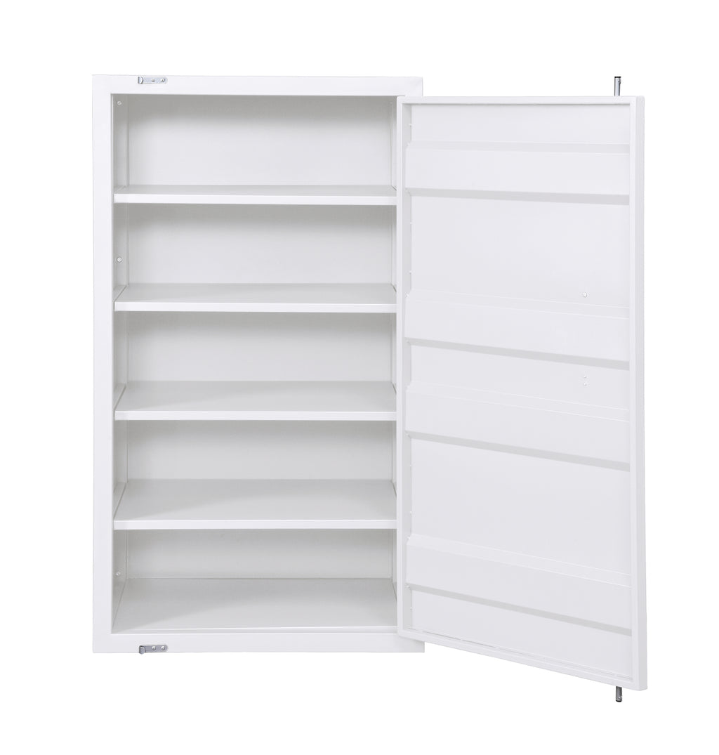 - The metal door opens to reveal five spacious compartments, complete with four adjustable metal shelves, allowing for flexible storage solutions for a variety of items, from books to tools to office supplies.