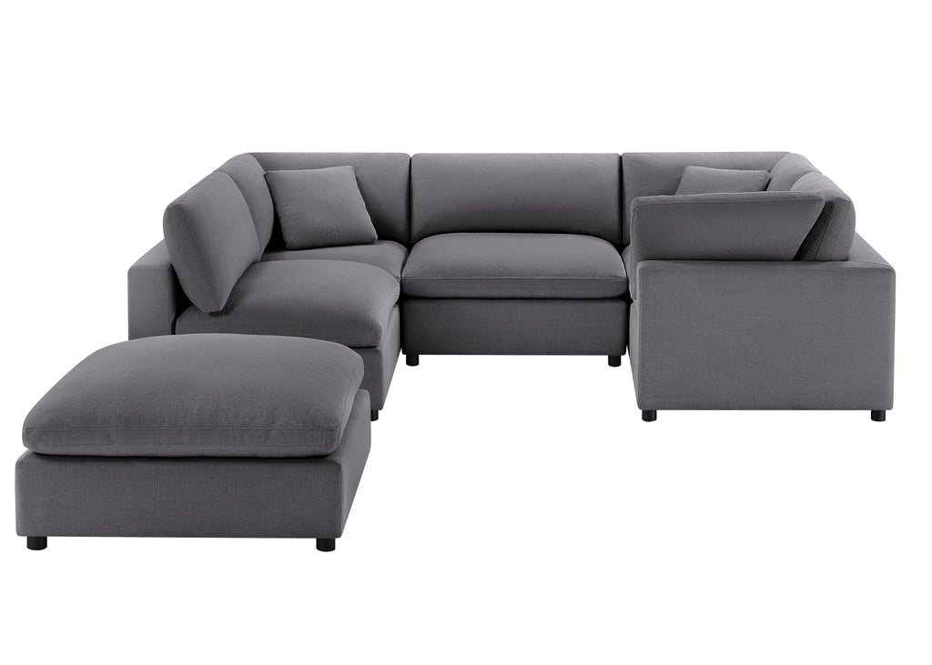 - Introducing the ultimate in comfort and versatility - our Cassandra Modular Sectional, designed to elevate your home living experience. Crafted with a sturdy solid hardwood frame, this sectional is built to last and withstand the rigors of everyday family life. Upholstered a variety of plush fabric options, each offering a luxurious look and feel that is both family and pet friendly. This sectional includes (2) armless chairs, (3) corner wedges, and (1) ottoman
