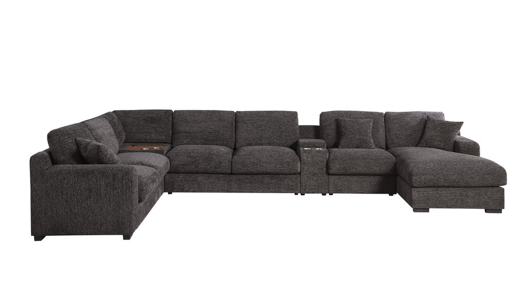 Experience unparalleled comfort and convenience with the Celine Sectional Sofa. Designed with a right-facing chaise, this sofa is perfect for lounging and relaxation. At the heart of its design is a center and corner console equipped with cupholders and charging ports, ensuring your devices stay charged while you unwind. This modular masterpiece includes an armless chair and loveseat, alongside a versatile console that can be assembled on either side to suit your space. The sofa comes with three plush throw pillows, enhancing its cozy appeal. Embrace both style and functionality with the Celine Sectional Sofa, a perfect addition to any modern living space.