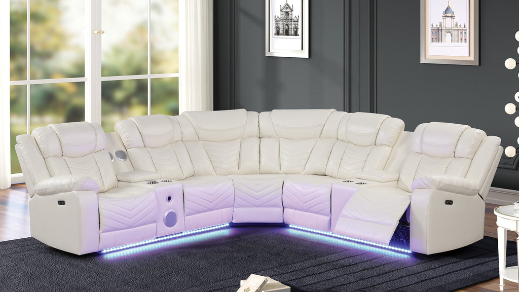 Introducing a stunning sectional sofa that combines comfort, style, and innovation seamlessly. Crafted with a sturdy manufactured wood frame, this luxurious sofa features a sleek faux leather finish that exudes sophistication. Take relaxation to the next level with its power recliner feature, allowing you to effortlessly find your ideal position. But that's not all this sectional sofa also comes equipped with stainless steel cup holders for added convenience, USB ports for charging your devices, and a control panel for the LED and Bluetooth features, transforming your living space into a modern entertainment hub. Elevate your lounging experience with this exceptional piece of furniture.