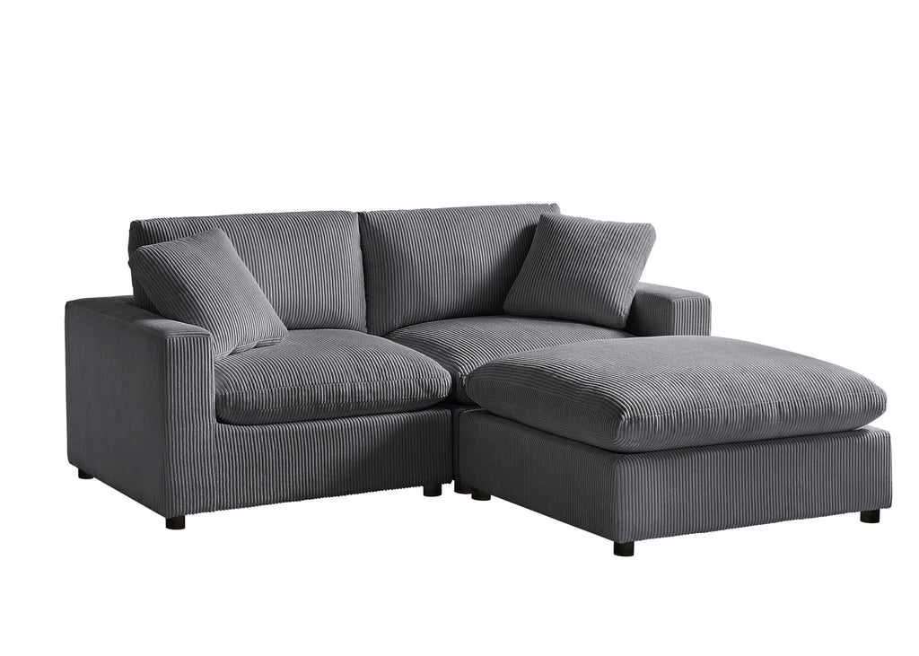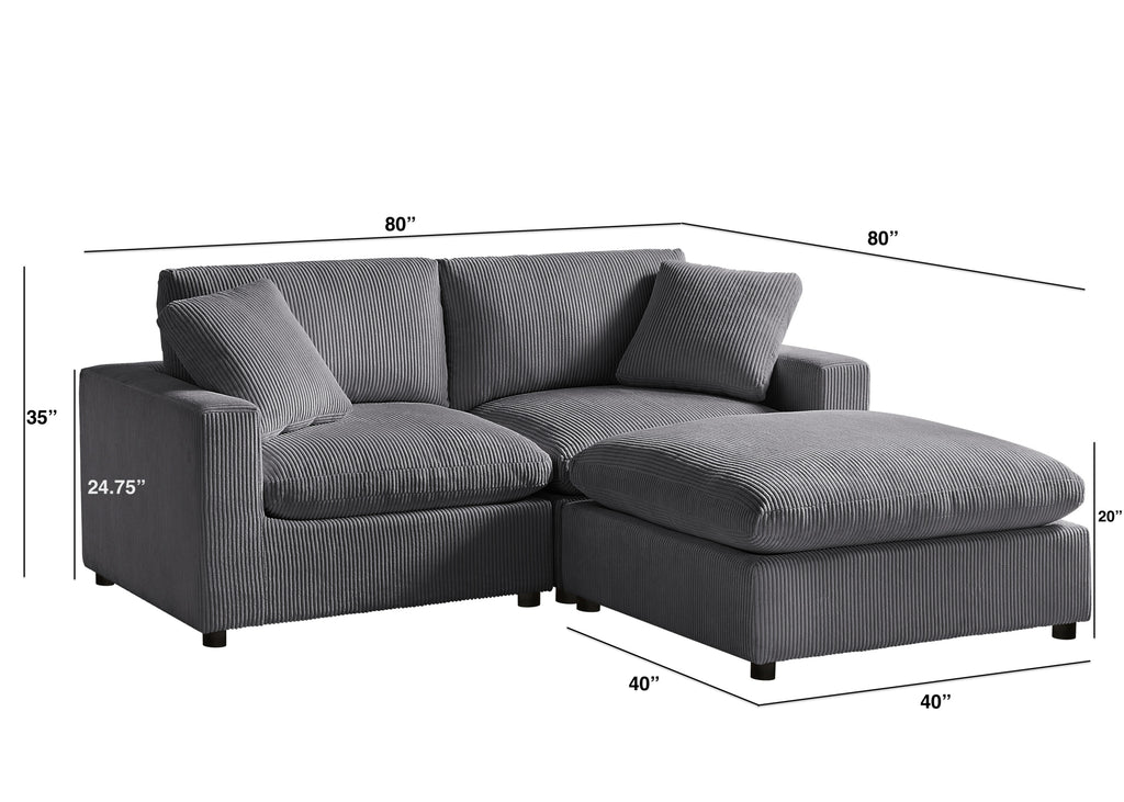 - Introducing the ultimate in comfort and versatility - our Chelsea Modular 3-piece Chofa, designed to elevate your home living experience. Upholstered in a variety of plush fabric options, each offering a luxurious look and feel that is both family and pet friendly. The Chofa comes with two matching throw pillows. Experience the convenience of easy-to-clean, family friendly furniture without compromising on luxury. This sectional includes (2) corner wedges, and (1) ottoman.