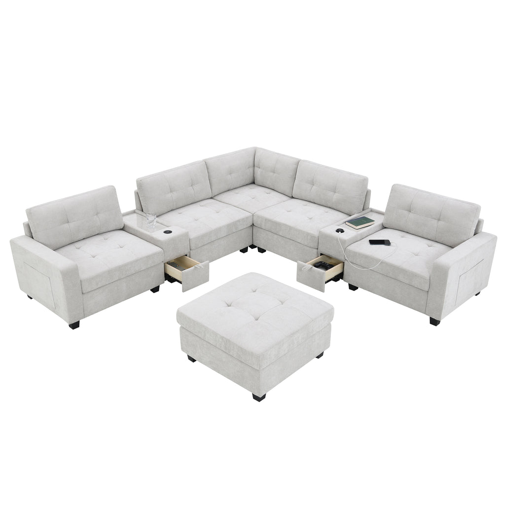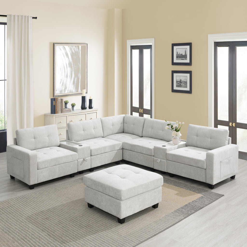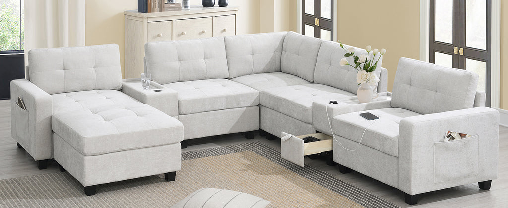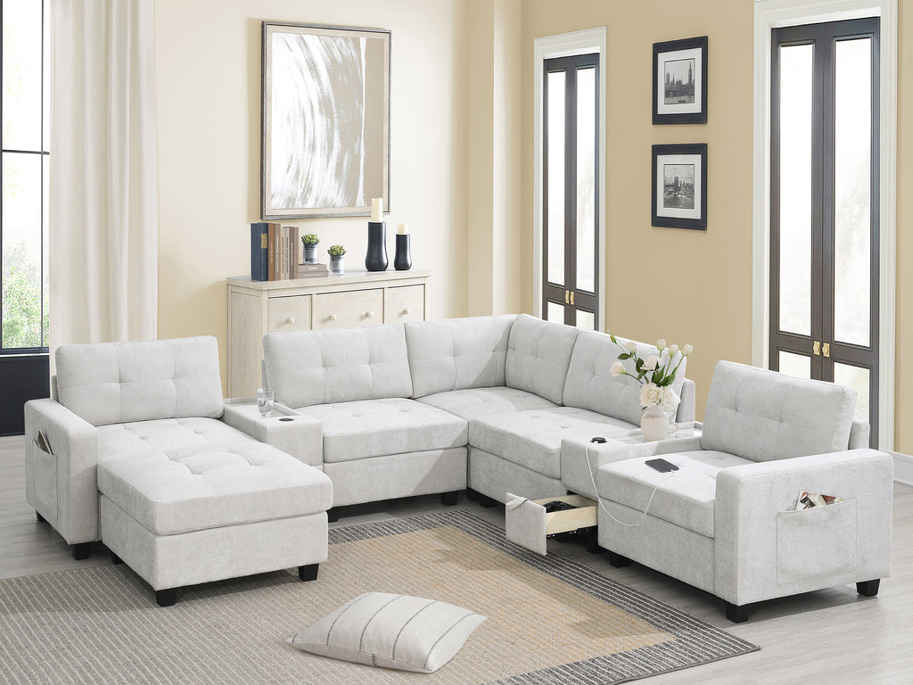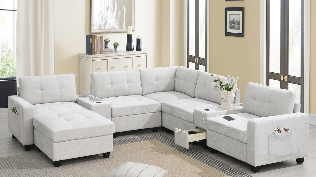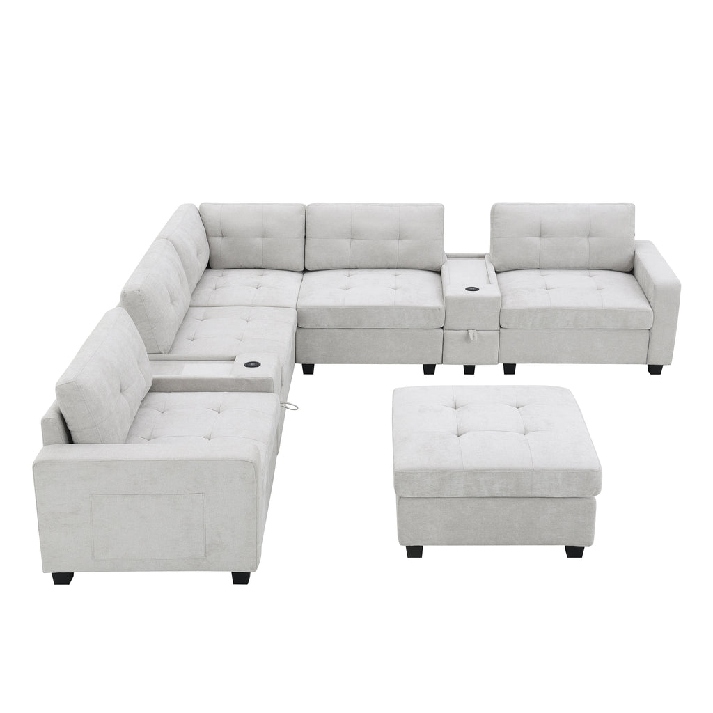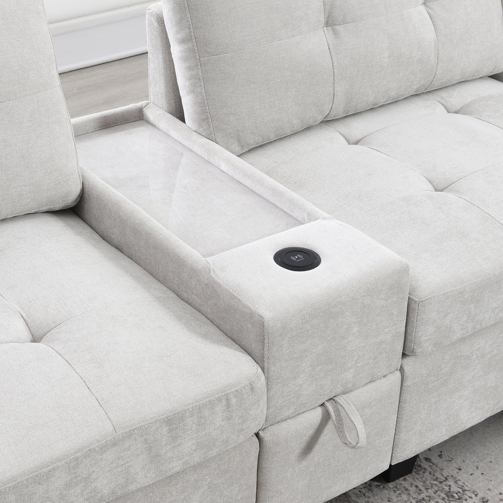 This sofa features two convenient consoles for added storage and easy access to everyday items. With extra-large storage compartments, you can keep your living space organized and clutter-free. Enjoy the convenience of wired and wireless charging, allowing you to power up your devices while relaxing. The sleek acrylic table top adds a touch of elegance to the design, while the modular chenille tufted upholstery offers both comfort and style. Perfect for any modern home, this sofa brings together functionality and sophistication in one exceptional piece.