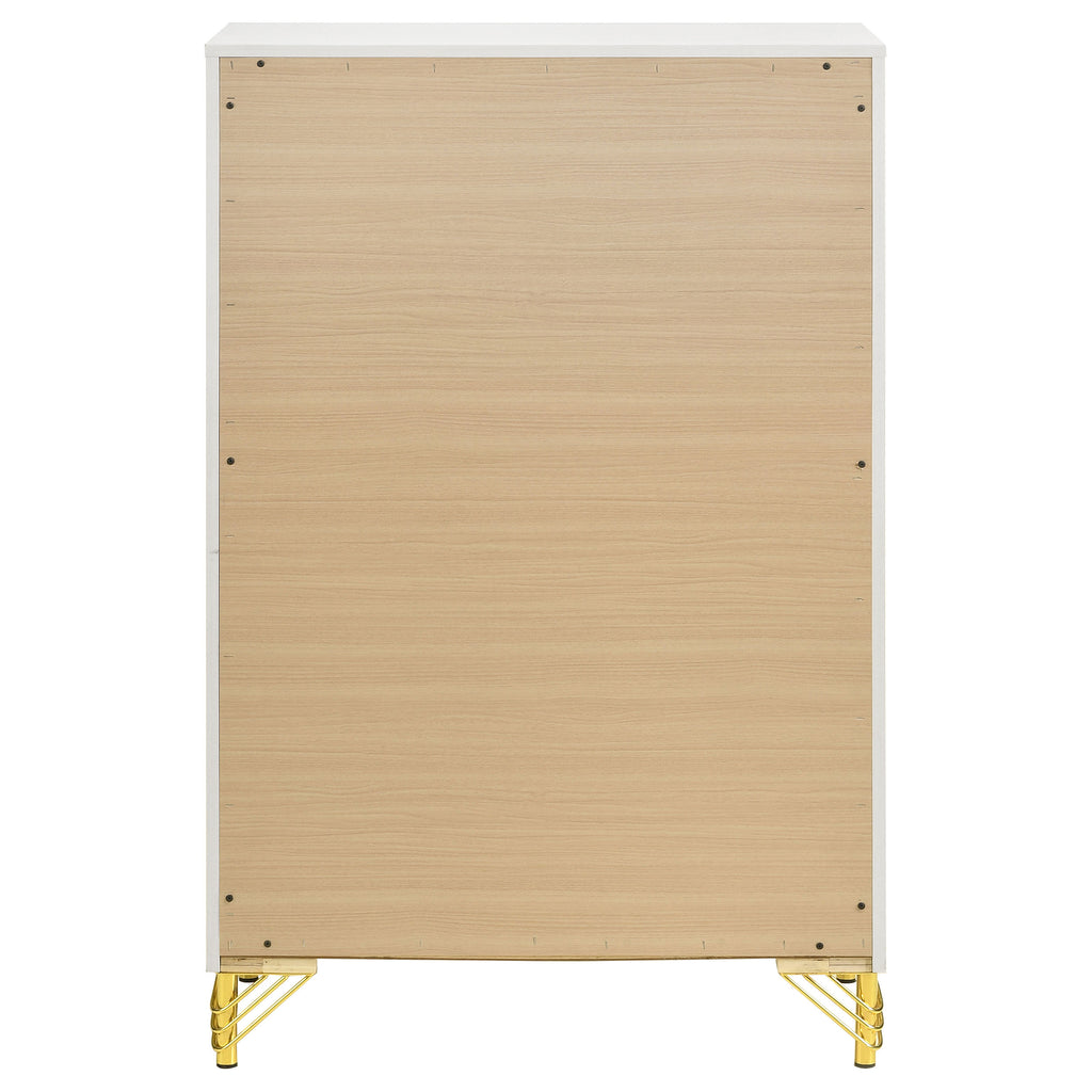 Add sophisticated storage options to your bedroom with a modern five-drawer chest that's outfitted with bright metallic gold finish trim and hardware that bring exquisite style and warmth. Its crisp white base finish complements any setting, while spacious drawers create ample storage for clothing and accessories.