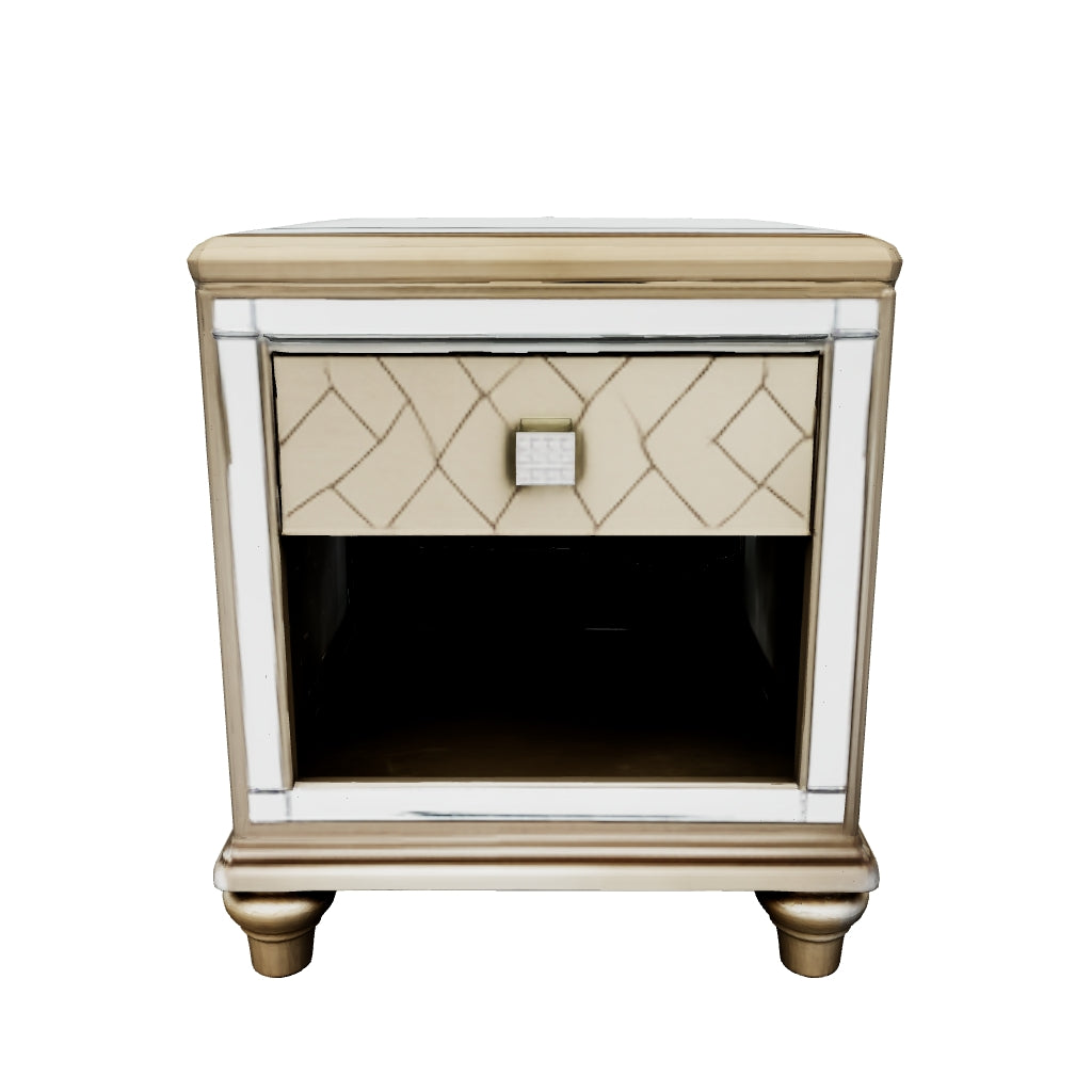Glamorous, chic and sophisticated. This rectangular end table is made with a metallic silvertone finish, inset beveled mirror panels and drawer pulls adorned with faux crystals. No matter how you style it, this table is a stunning addition to your contemporary decor.