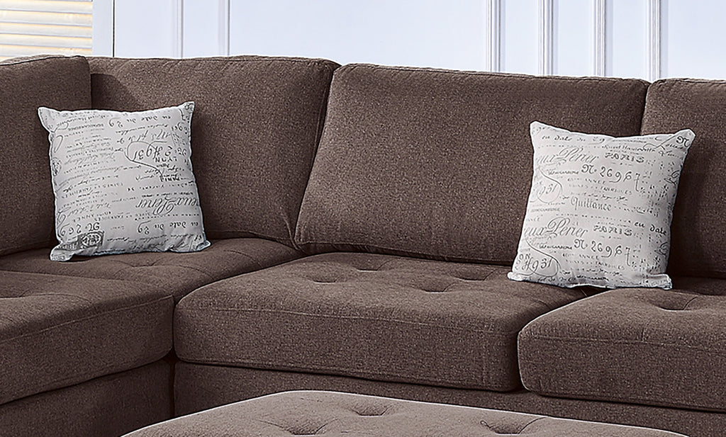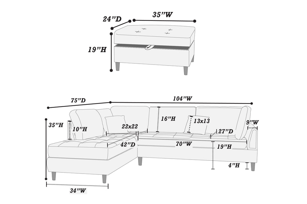 Thoughtfully designed to be both functional and inviting, this set includes a spacious sofa, a reversible chaise, and a matching ottoman that doubles as extra storage, making it the perfect centerpiece for any modern living space. The sectional’s L-shaped layout makes it easy to create a welcoming gathering spot for family and friends, offering plenty of seating while still maintaining an open flow within your room. Each piece is upholstered in soft chenille fabric, which not only enhances comfort but also blends effortlessly with a variety of home décor styles. The neutral tone pairs beautifully with the clean design, allowing it to shine in both contemporary and casual interiors. Designed with flexibility in mind, the chaise can be positioned on either the left or right side of the sofa to accommodate your space and preference. This adaptability makes it an excellent choice for both large living rooms and smaller apartments, giving you the freedom to rearrange as needed. The ottoman is more than just a footrest — it features a hidden storage compartment that provides the perfect spot to tuck away blankets, magazines, or extra pillows, keeping your living area neat and organized. Details such as tufted seat cushions and the tufted top of the ottoman bring a tailored look to the design, adding texture and sophistication to the clean-lined silhouette. Resting on wooden legs in a nude finish, the sectional is elevated with a touch of warmth and modern charm. To complete the look, the set includes two decorative throw pillows featuring elegant French script designs, offering both style and comfort. This sectional set is perfect for everyday lounging, weekend movie nights, or casual entertaining. With its blend of stylish design, practical storage, and adaptable layout, this 3-piece sectional with ottoman brings comfort and convenience to the heart of your home.
