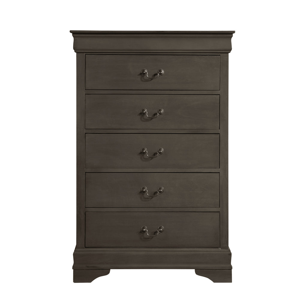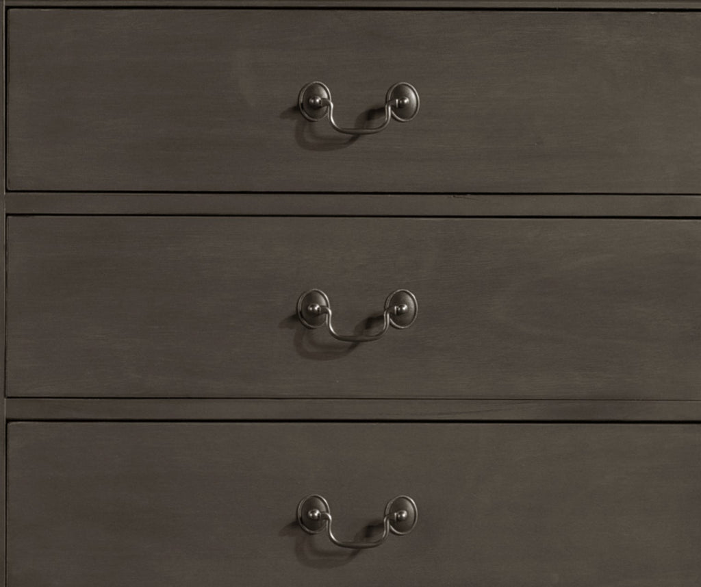 Traditional in design and modest in scale, the elegant Mayville Collection takes its design inspiration from the classic Louis Philippe styling. The Okume veneer of the chest is paired with a stained gray finish and is accentuated by antique brass tone drop handles.