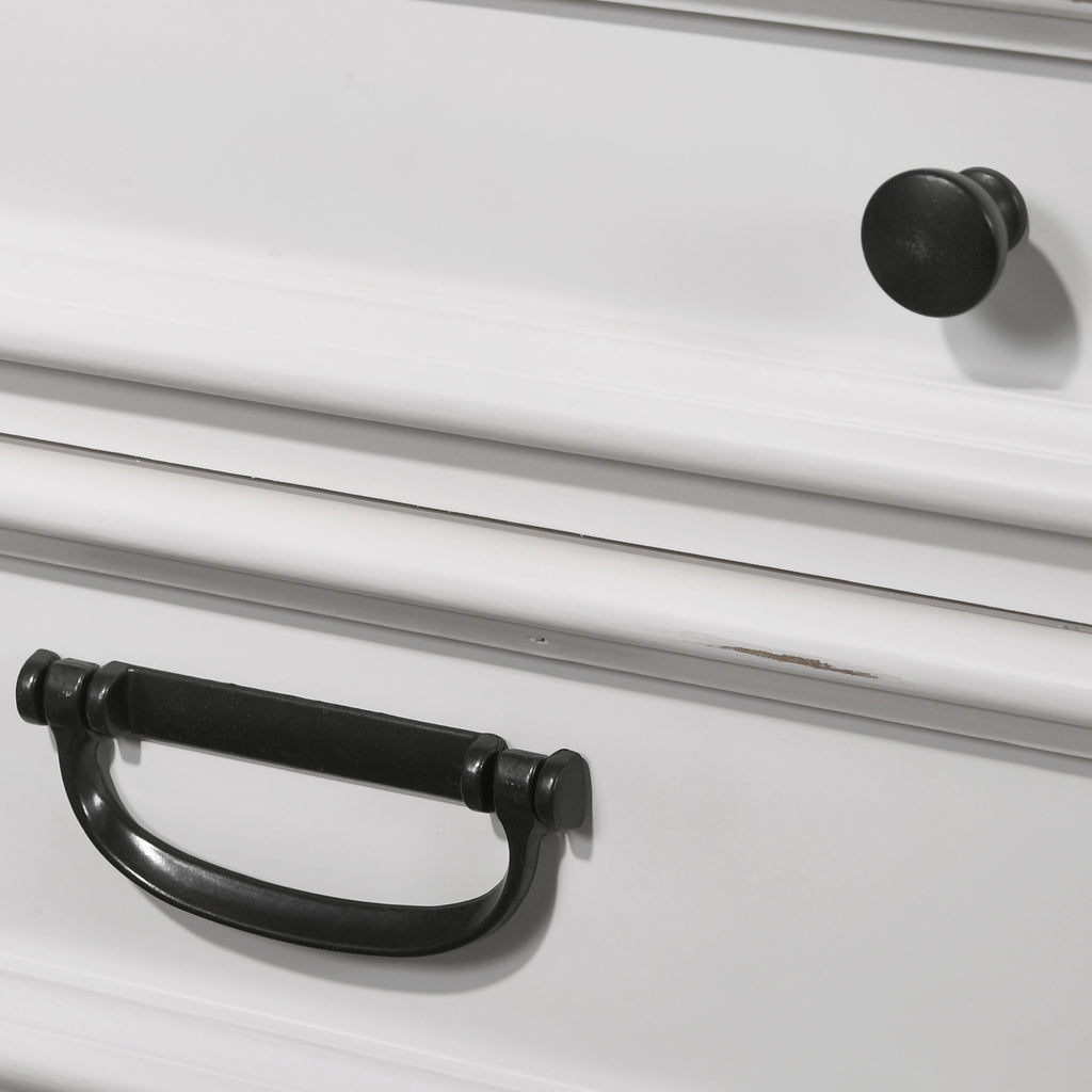 - English dovetail drawer construction with full extension metal ball bearing drawer glide. 5-step process weathered white finish with preserving lacquer top coat, dark Gray finished top panel