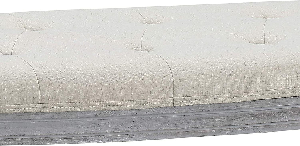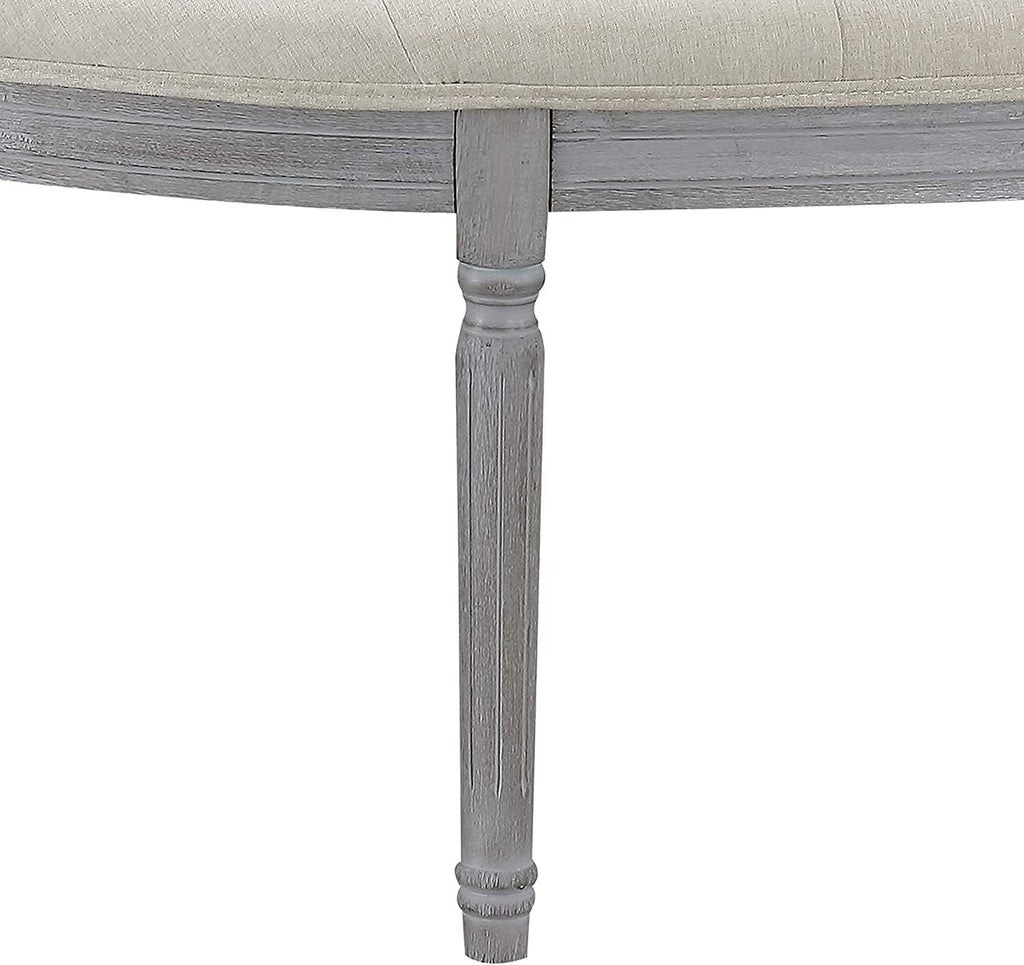 - Upholstered in light beige polyester fabric with weathered gray wooden legs