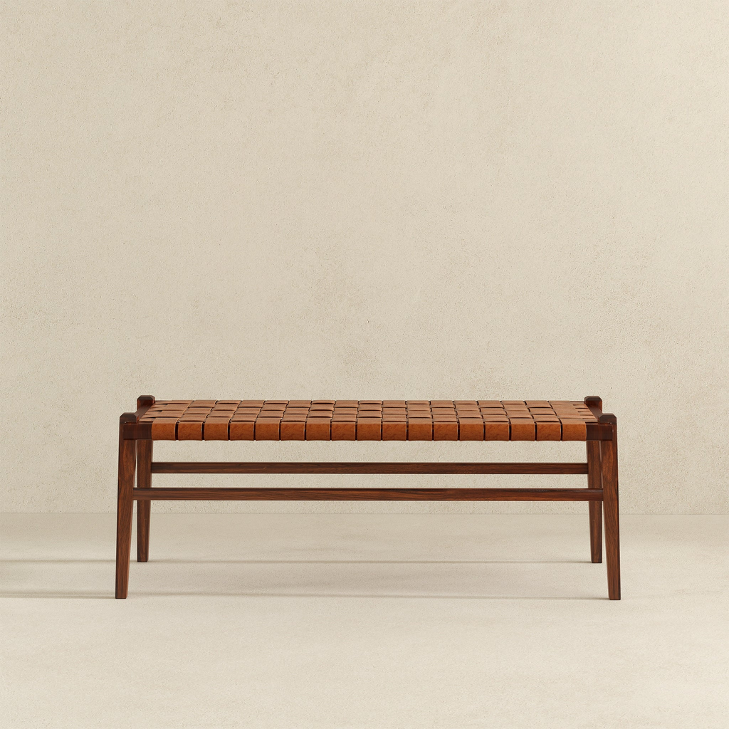 - A Mid-Century modern update to a retro classic, the Sam upholstered bench is gorgeously adaptable. Its seat cushion is crafted of high-quality genuine leather provides comfortable sitting for up to 2.