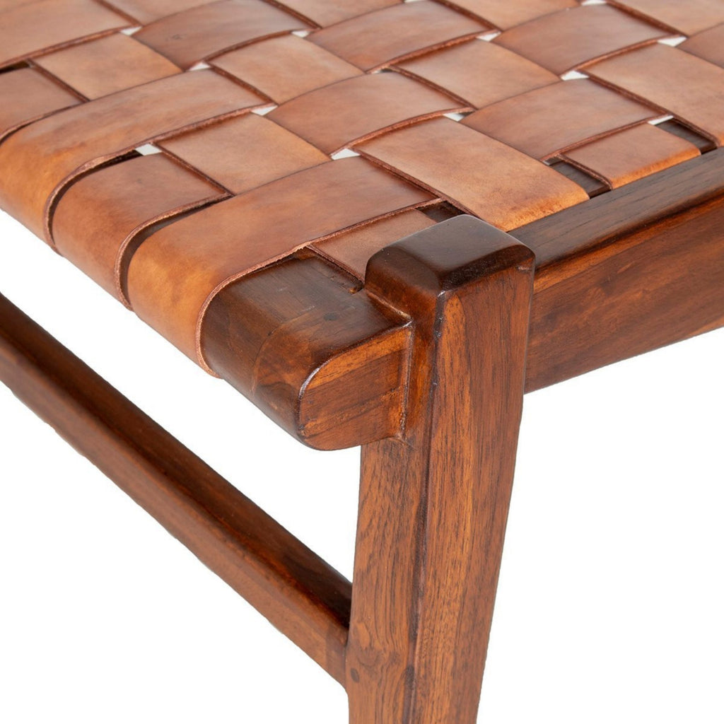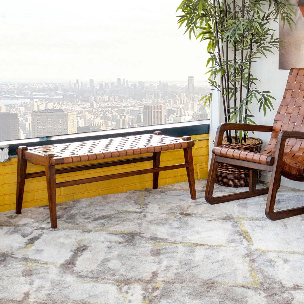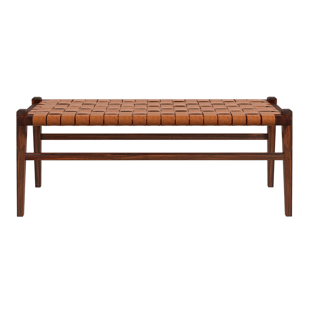 - This Tan accent bench is constructed of a sturdy solid wood frame and boasts tapered solid wood legs in a rich finish to convey a refined aesthetic with a hint of mid-century flair. Can be cleaned with a non-abrasive cleaning solution followed by a quick microfiber cloth.