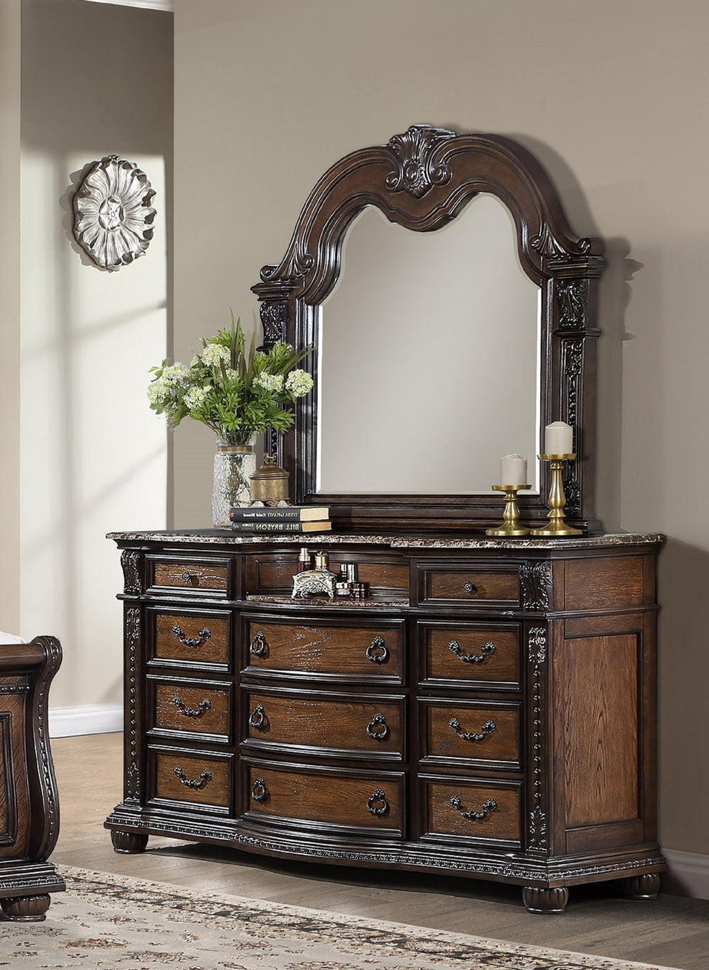 This Dresser offers generous storage while maintaining the sophisticated aesthetic. Antiqued hardware adds a final touch of elegance, ensuring this collection will elevate your bedroom into a luxurious retreat.