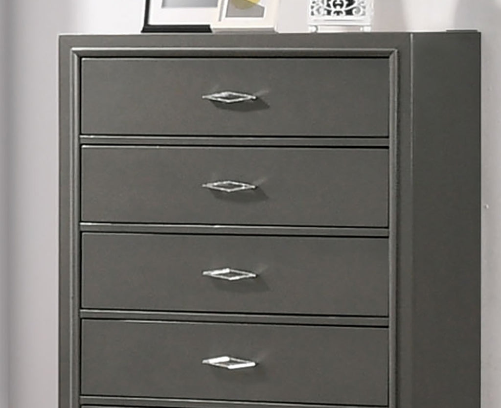 Illuminate any space with this beautiful chest, which features a gray finish with a slight sheen. Translucent hardware made of acrylic materials adds to the luminous potential of this piece.