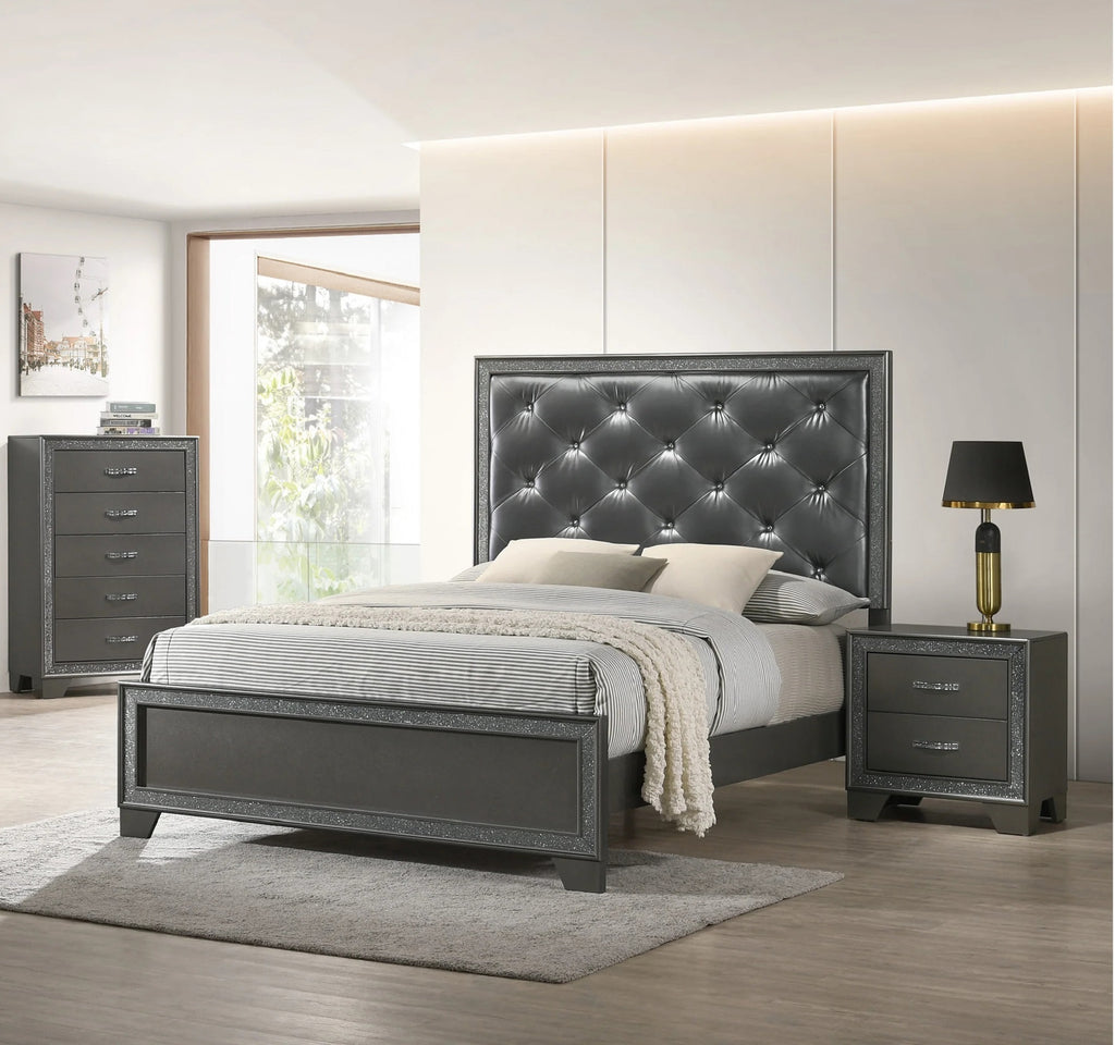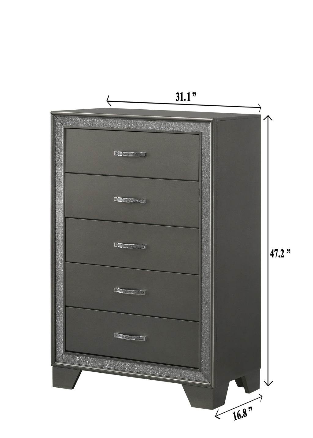 This chest will surely make a statement in your bedroom. It features five drawers, a sparkling accent band around the drawers and comes in a dark gray finish.