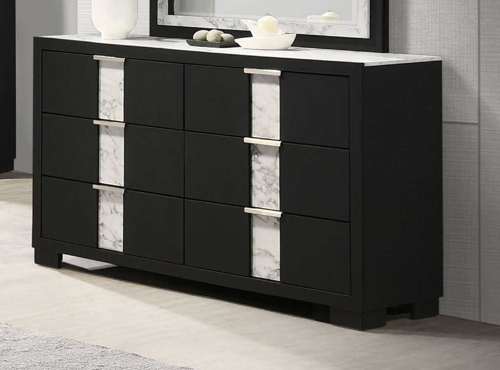 This sleek and modern 6-drawer dresser is an ideal storage solution for any bedroom. It features a stylish black white finish and elegant metal drawer pulls that add a touch of flair. The dresser is constructed from high-quality materials and is built to last. With six spacious drawers, you'll have ample storage space for all your clothing and accessories. The clean lines and contemporary design of this dresser make it a stylish addition to any bedroom decor. Whether you're looking to update your current bedroom or furnish a new one, this 6-drawer dresser is sure to impress.