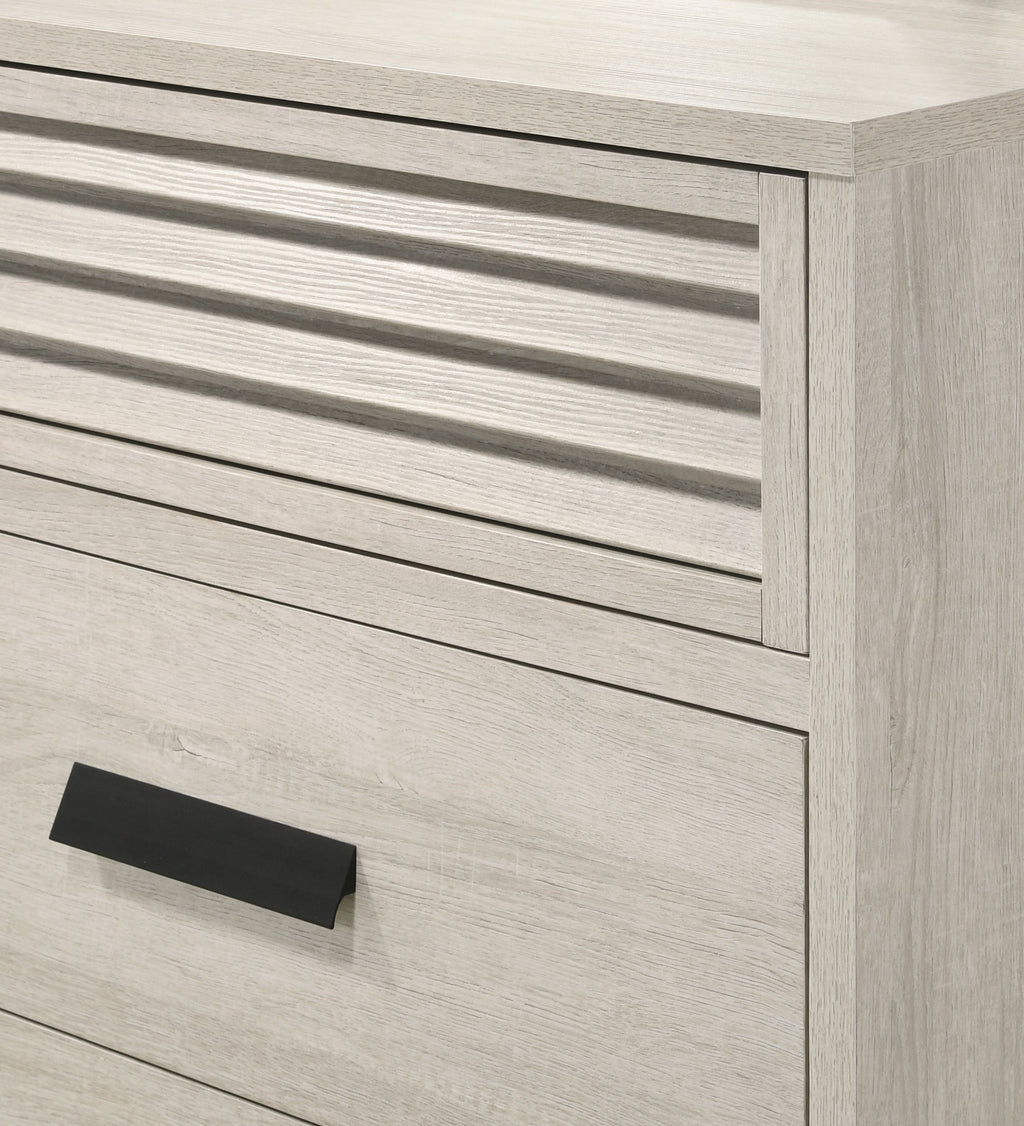 Description:- This chest will surely make a statement in your bedroom. It features five drawers, a finger pull hardware, and comes in a white finish.