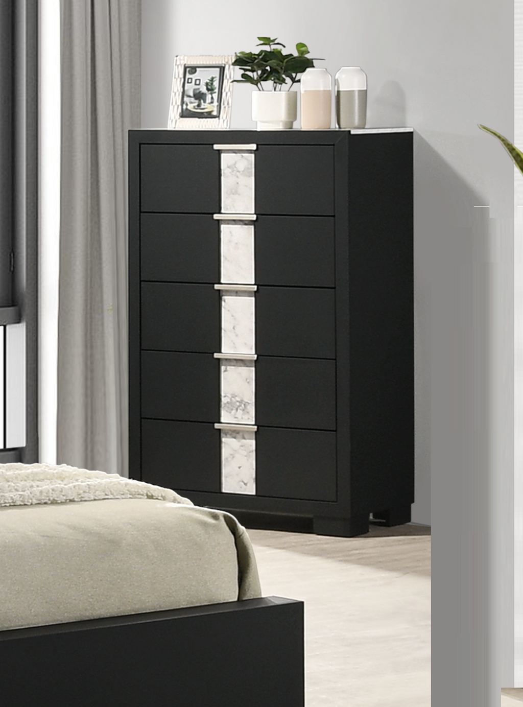 This 5-drawer bedroom chest is a stylish and functional addition to any bedroom decor. It features a sleek and modern grey and black finish, complemented by elegant metal drawer pulls that add a touch of sophistication. With five spacious drawers, there's plenty of room for all your clothing and accessories. The sturdy construction and high-quality materials ensure that this chest is built to last. It's perfect for adding extra storage space to your bedroom and its clean and simple design will blend seamlessly with a wide range of decor styles. Whether you're looking for a standalone piece or to complete a full bedroom set, this 5-drawer bedroom chest is a practical and stylish choice.